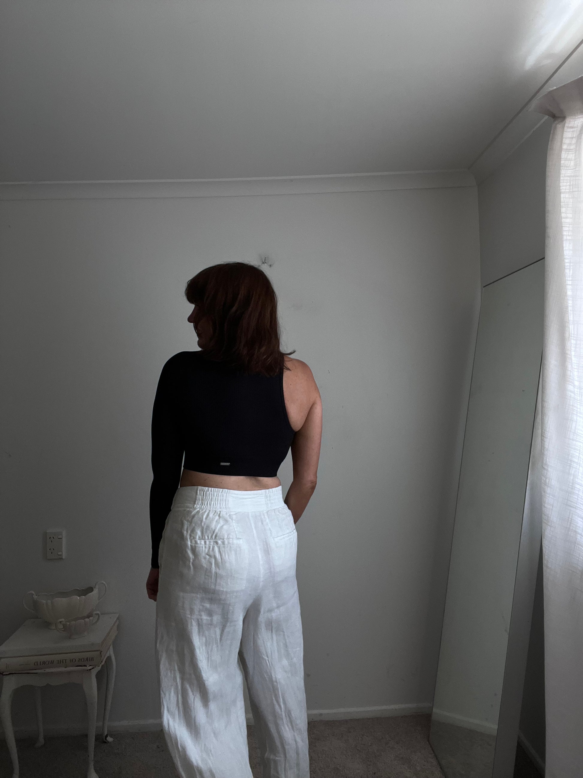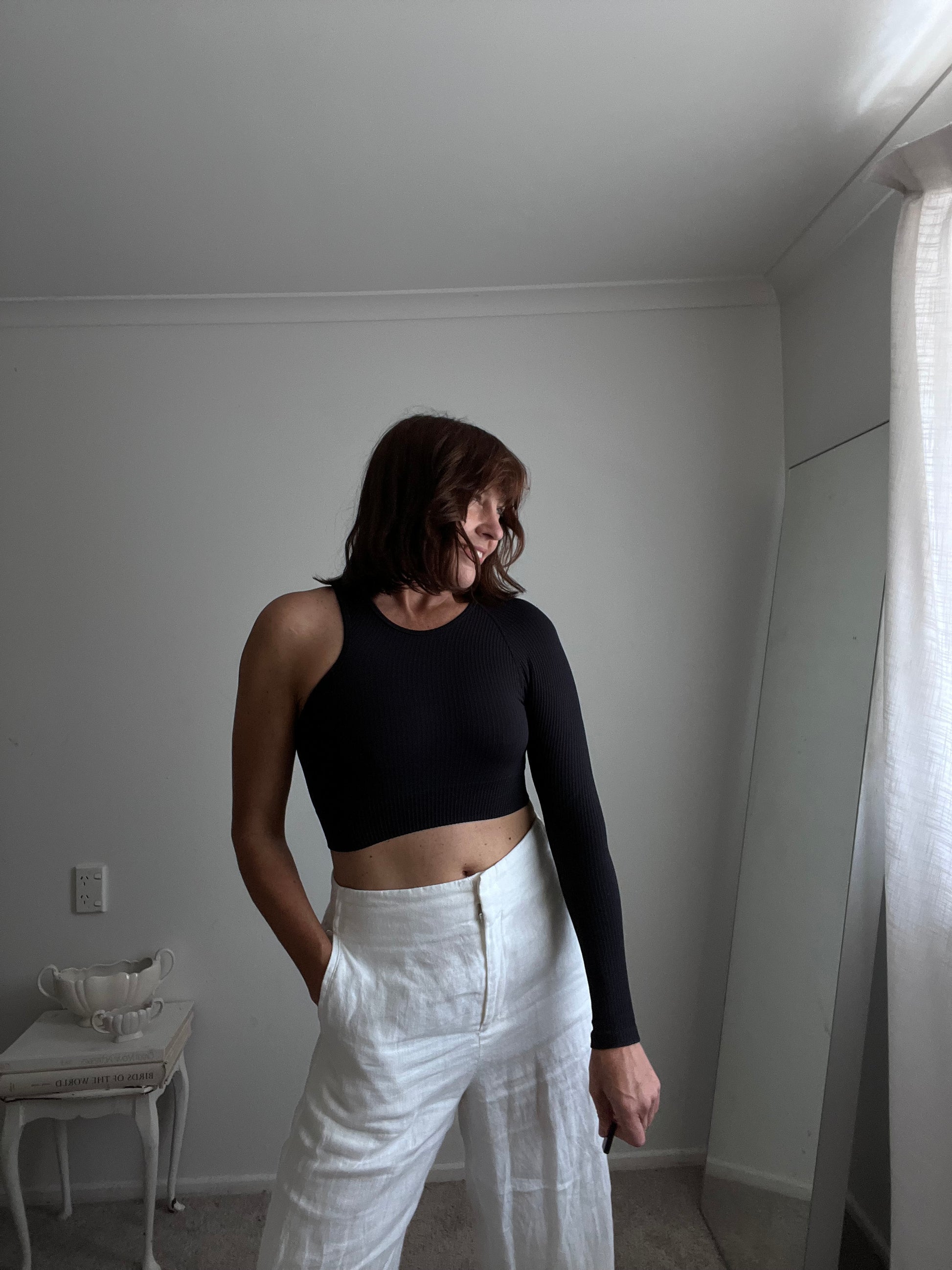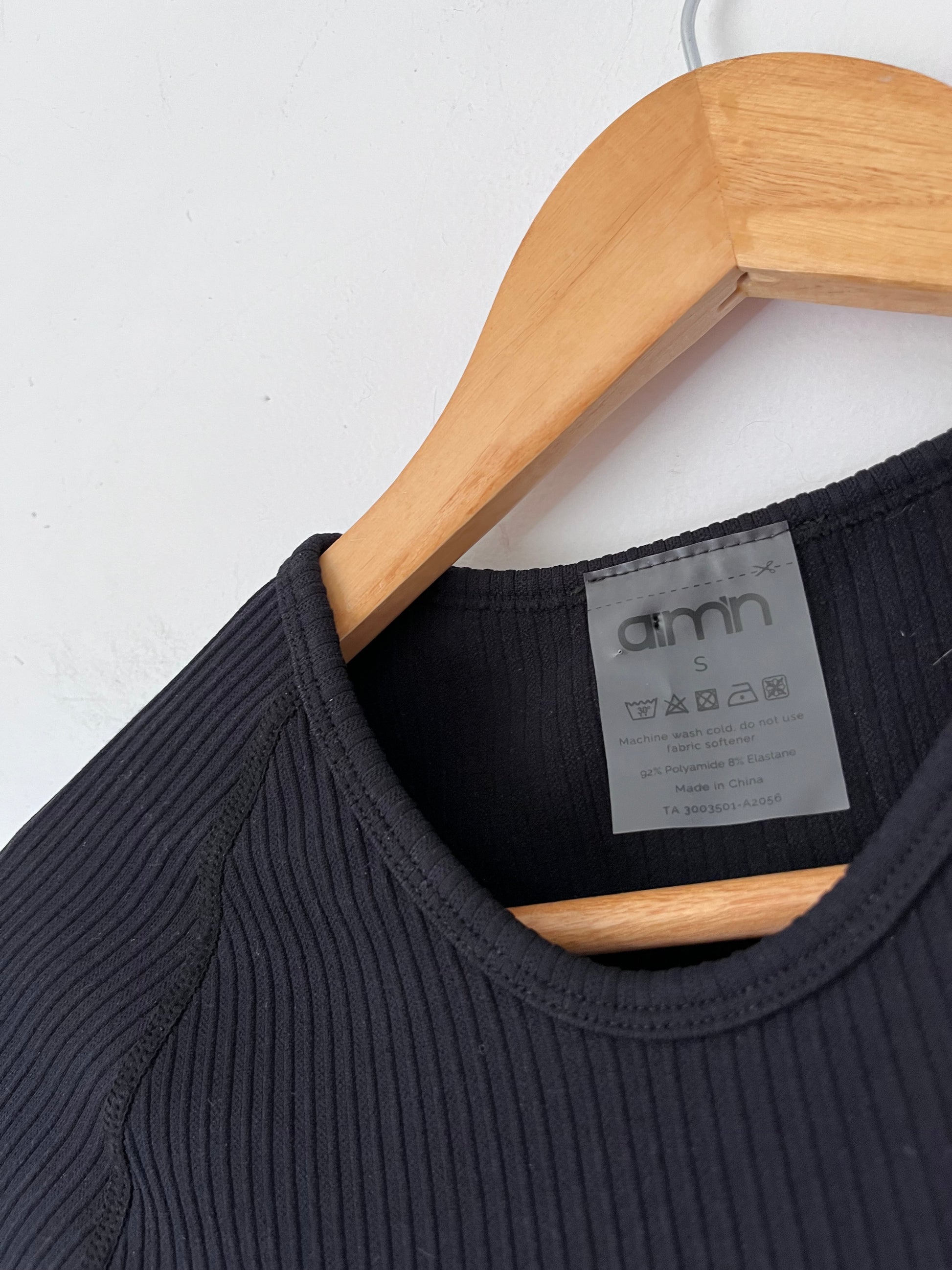 Size imo: 10. Tagged size: S. AIMN ribbed black top with long single sleeve and cut out. Composition: polymide, elastane. Faults: none