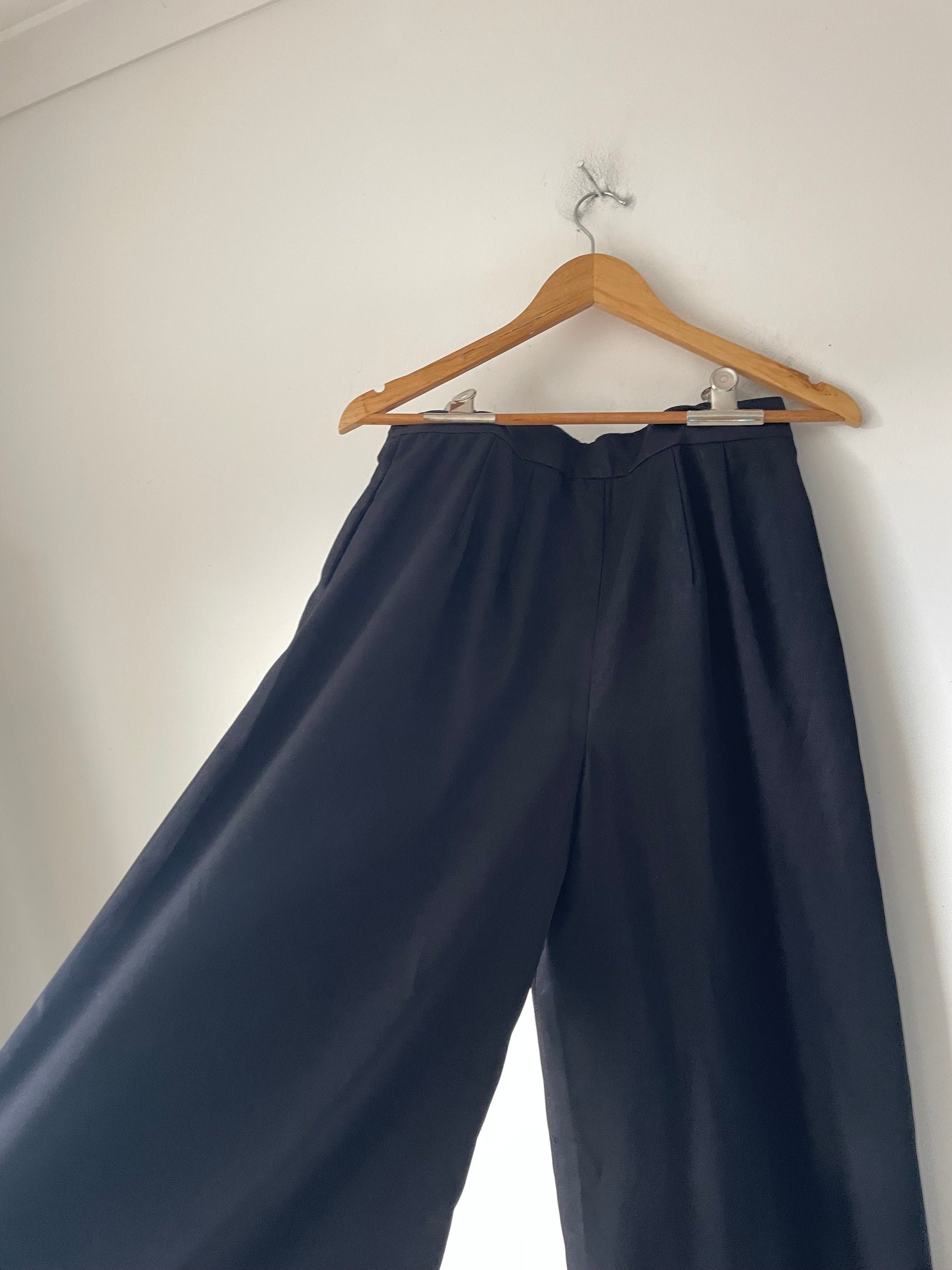Size 10 imo. Tagged 12. RRP$189. Description: BLAK LUXE black wide leg pants with long slit front. Very high waisted, these are very tight through tummy on me at size 12, I think they'll work best on a tall size 10. Length 110cm. Rise 34cm. Waist 76cm Composition: Reiko Triacetate, Poly - thick, slightly ribbed texture with a sheen