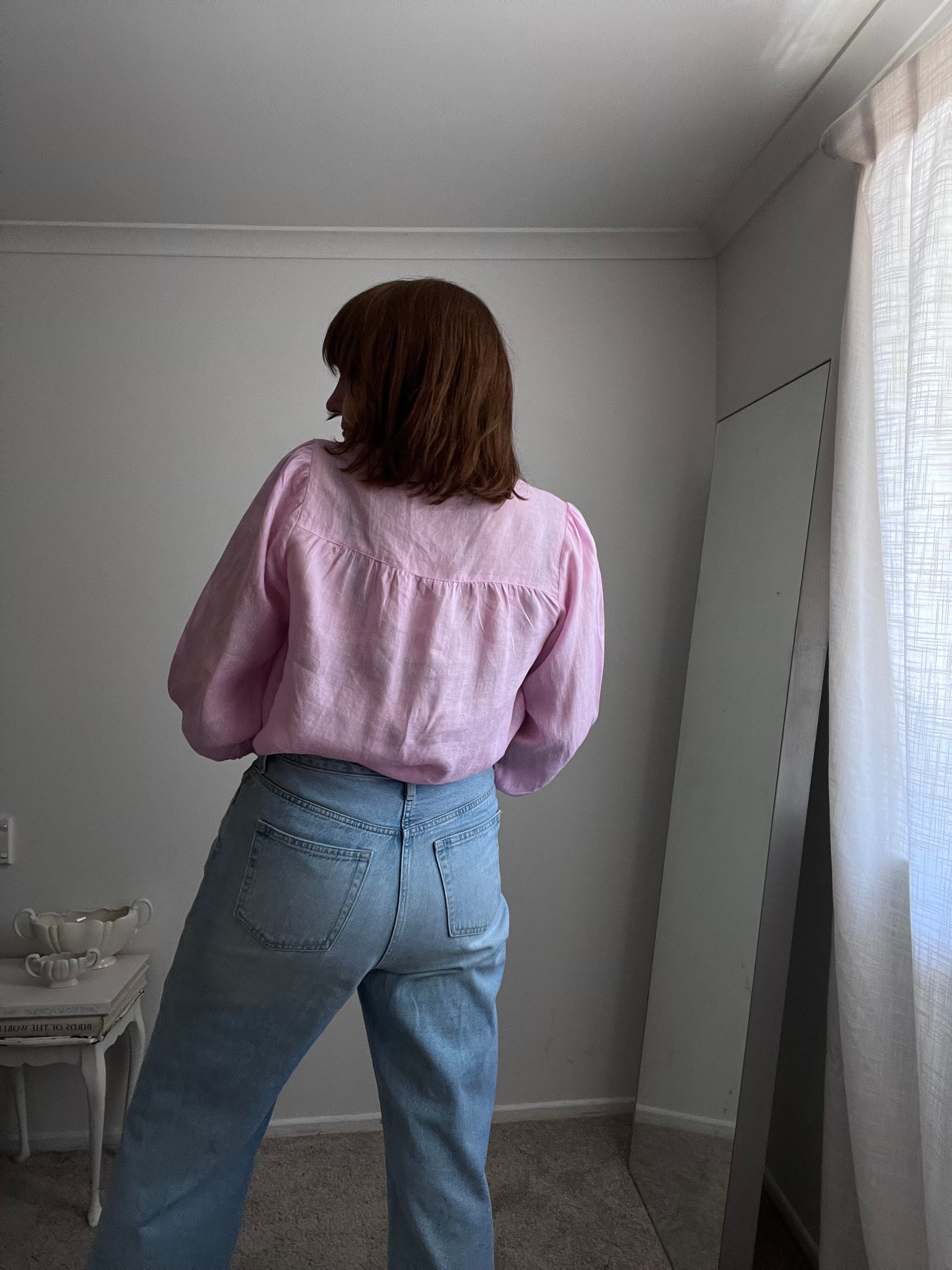 Size imo: 10-12. Tagged size: 10. RRP$119. DECJUBA pink linen shirt. Length 65cm. Armpit-armpit 54cm. Composition: pure linen. Faults: none