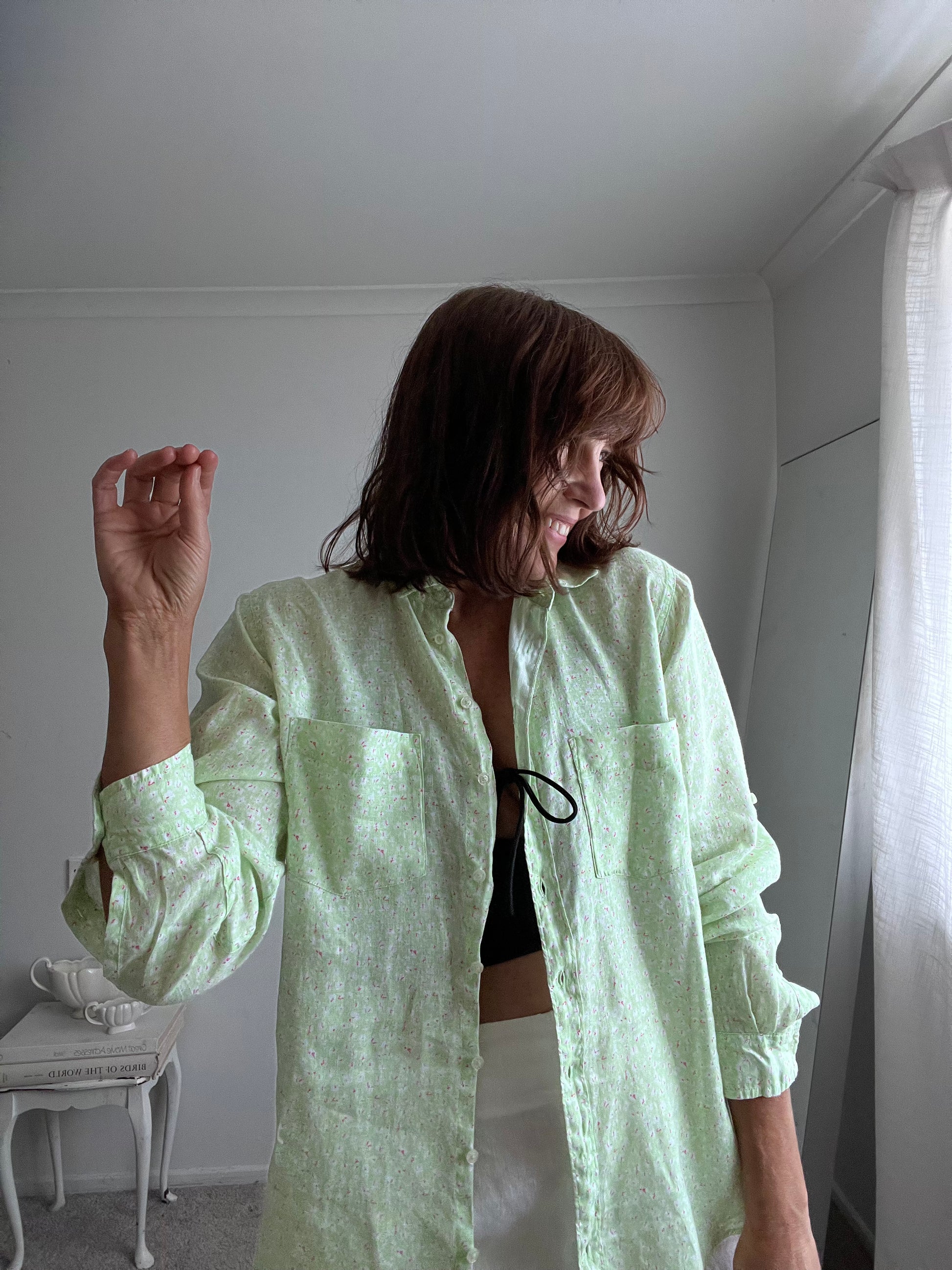 Size imo: 8-12. Tagged size: XS. RRP$199. HUT Linen Shirt. Length 70cm. Armpit-armpit 54cm. Composition: soft linen. Faults: none “Our Boyfriend Linen Shirt is designed for that oversized, relaxed look.