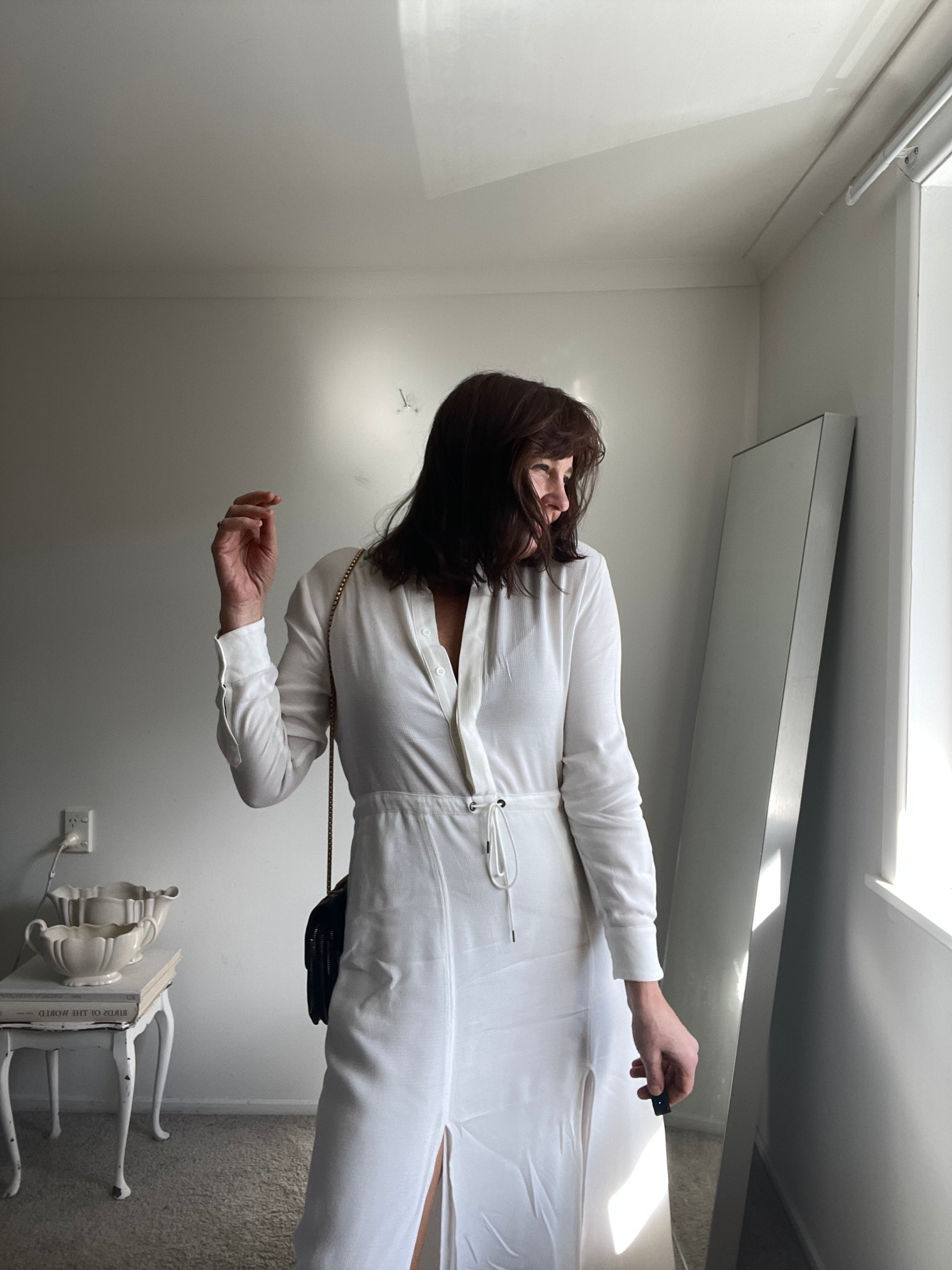 Size 8-10 imo. Tagged 8. RRP$600+. JULIETTE HOGAN dress with split skirt. A textured material. Drawstring waist. Length 135cm. Armpit-armpit 52cm. Composition: textured viscose .