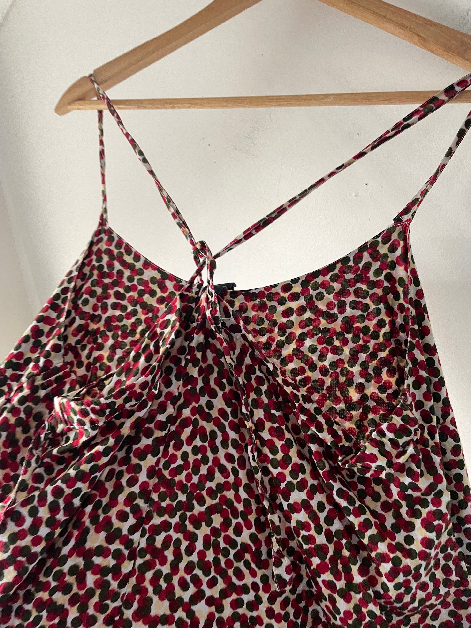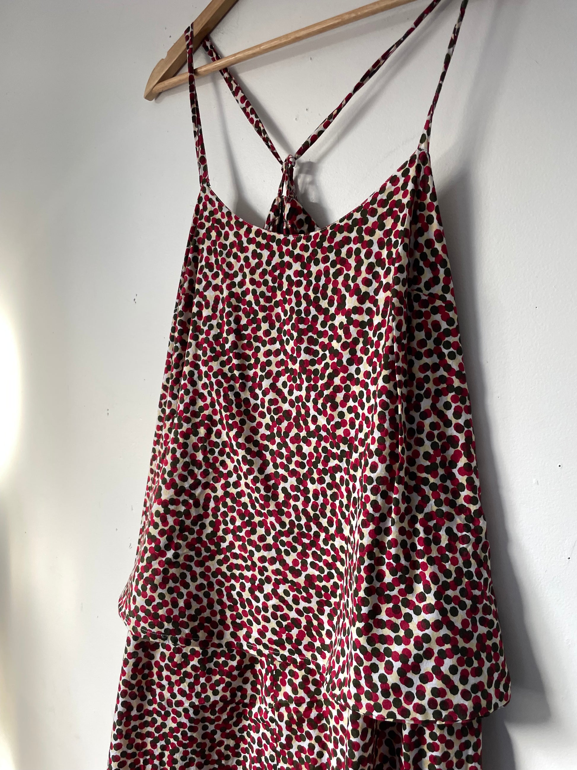 Size 14. Tagged L. RRP$239 (brand RRP indication ~$220‑$260). KOWTOW relaxed dress in organic cotton with vibrant red and navy abstract dot print; featuring adjustable spaghetti straps and tiered skirt. Length 106 cm. Armpit to armpit 53 cm. Composition: organic cotton.
