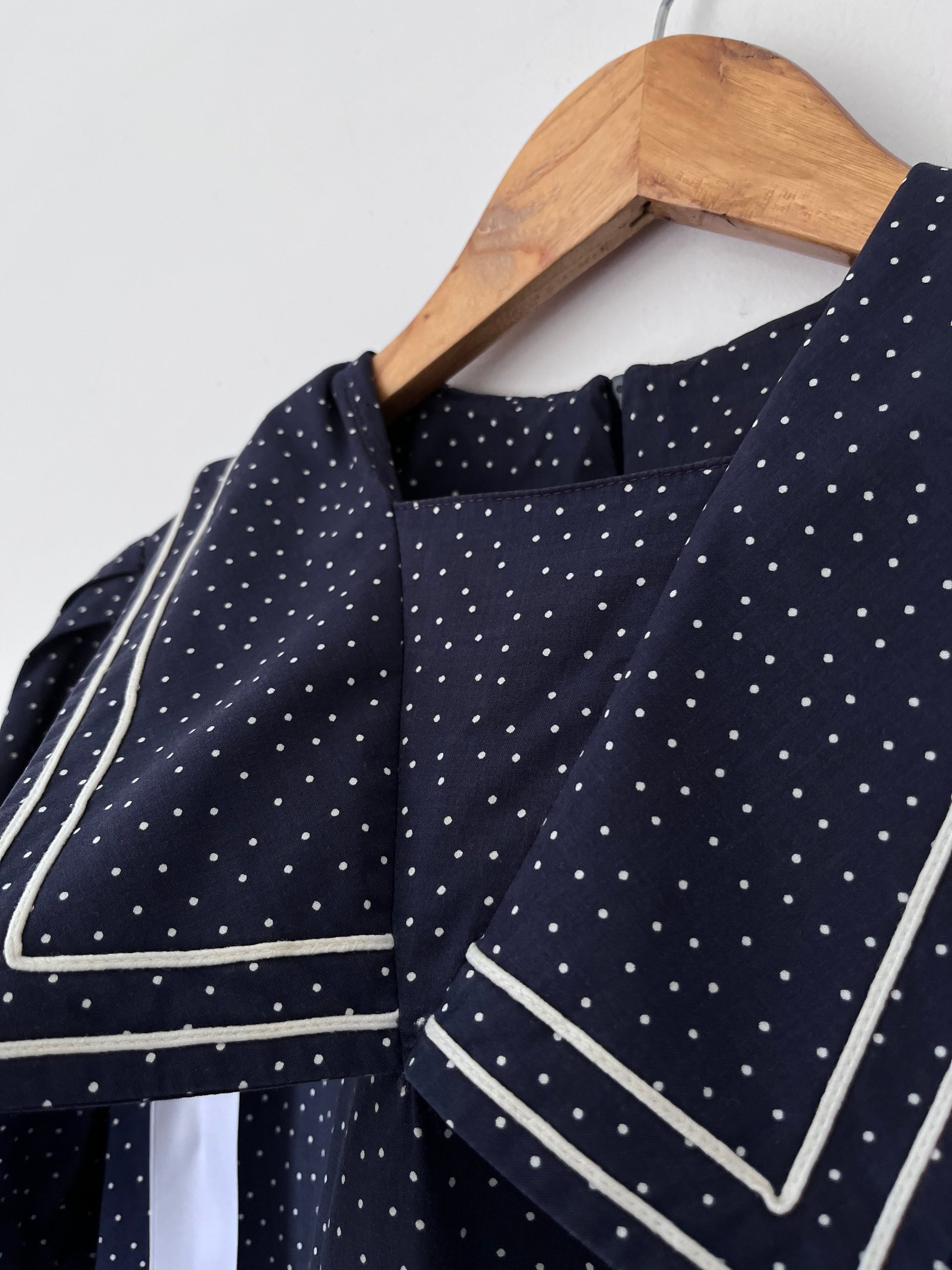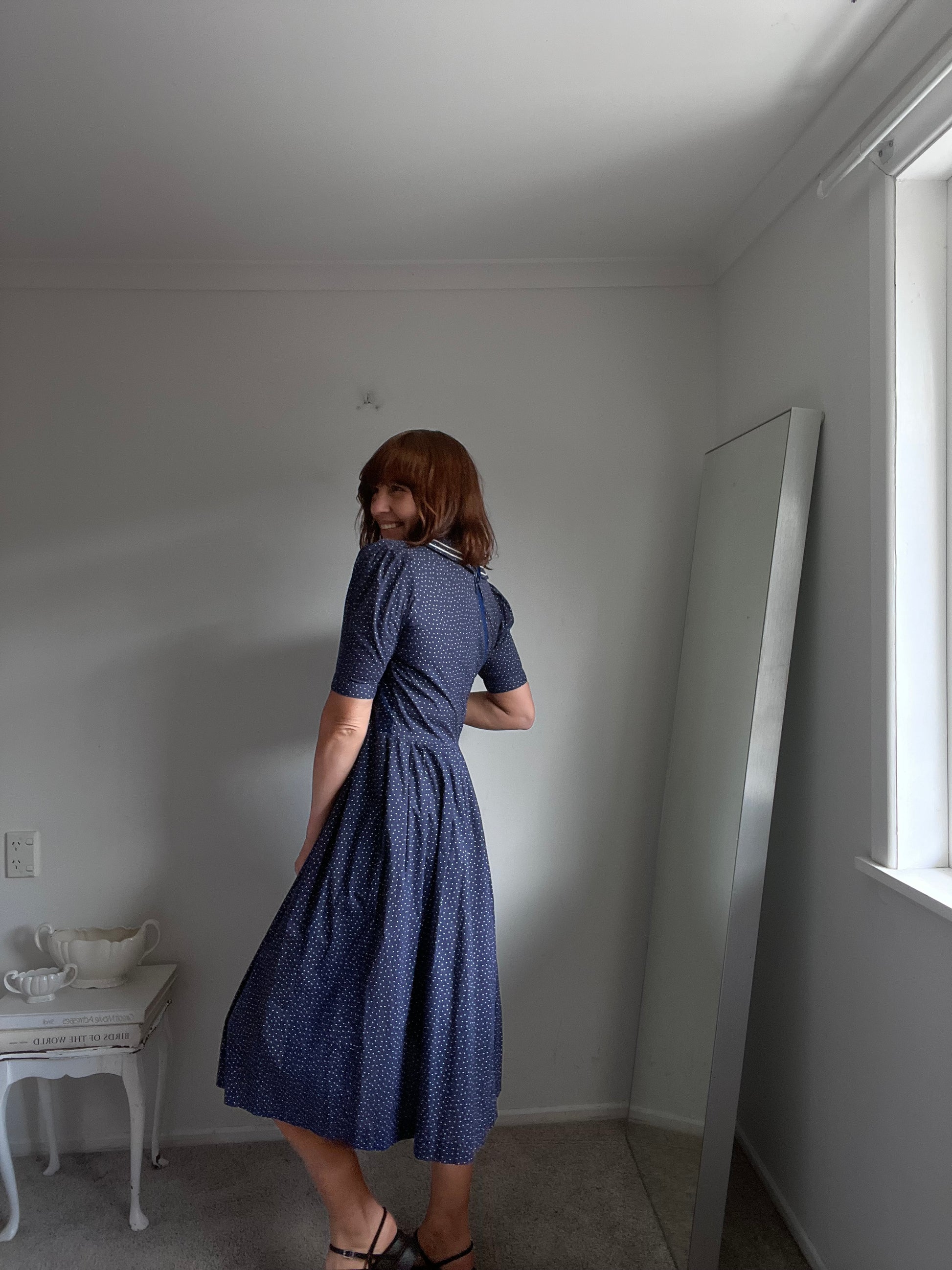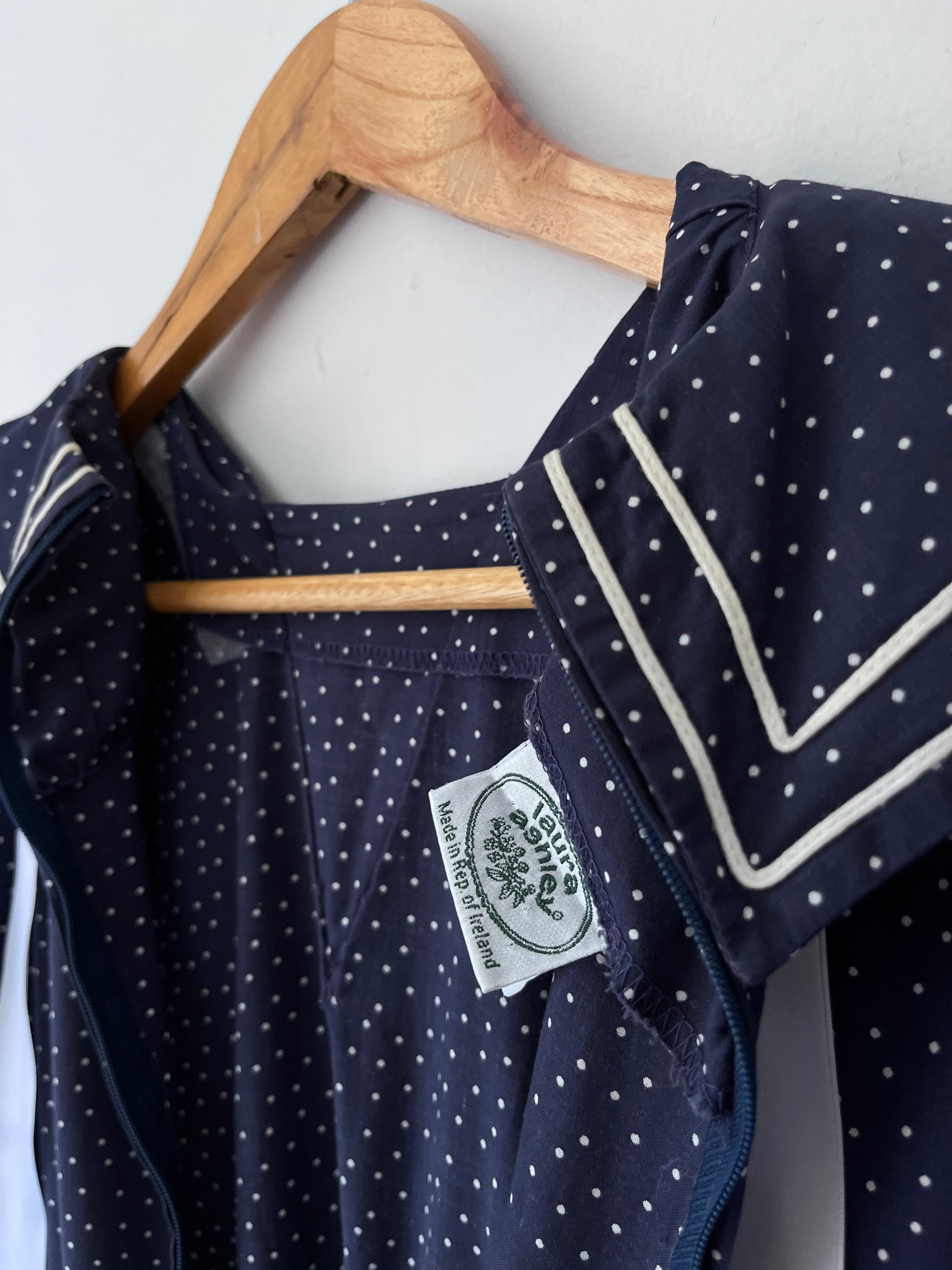 Size imo 8-10. Tagged size 10. LAURA ASHLEY navy spot dress - so sweet! Ribbon could easily be removed as could the modest top part (that part would require cutting out). Length 113cm. Armpit-armpit 48cm. Composition: cotton. Faults: a clever sewer has added two narrow panels down the sides to size this dress up - the material they’ve used is slightly different but I only noticed when measuring! Very well done & not noticeable on.