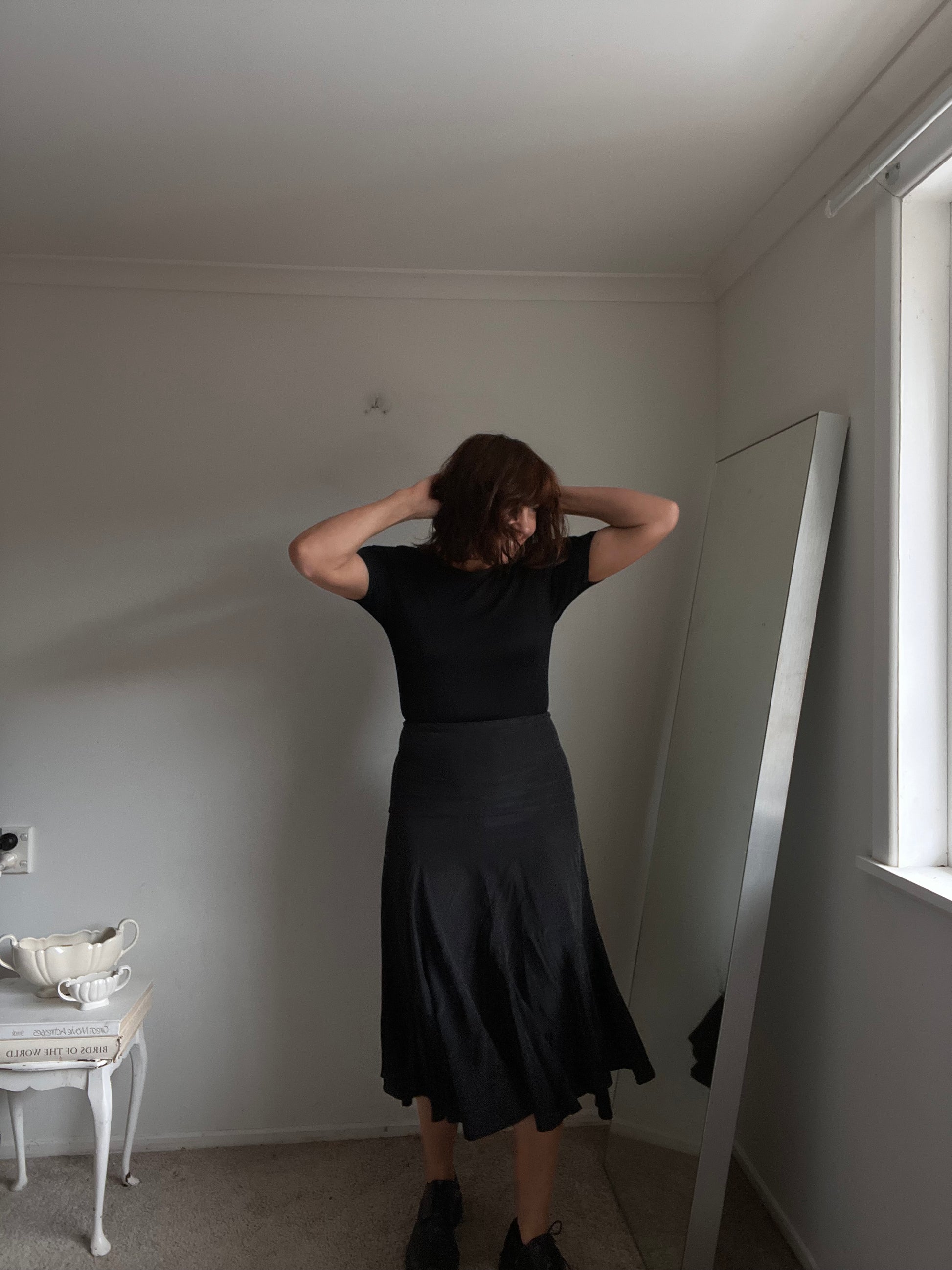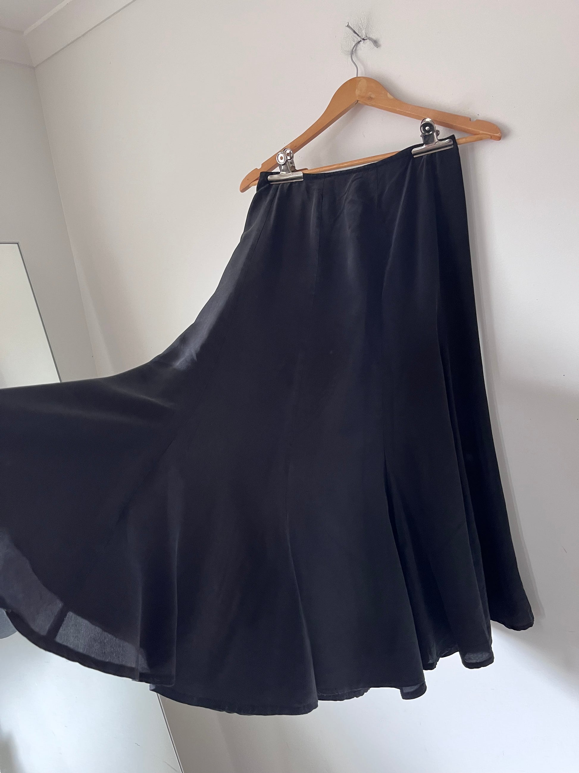 Size imo: 8. Tagged size: 8. RRP$200 approx. Black silk skirt by LIAM, Fit and flare. Not zipped on me. Length 80cm. Waist 70cm. Composition: silk. Faults: none