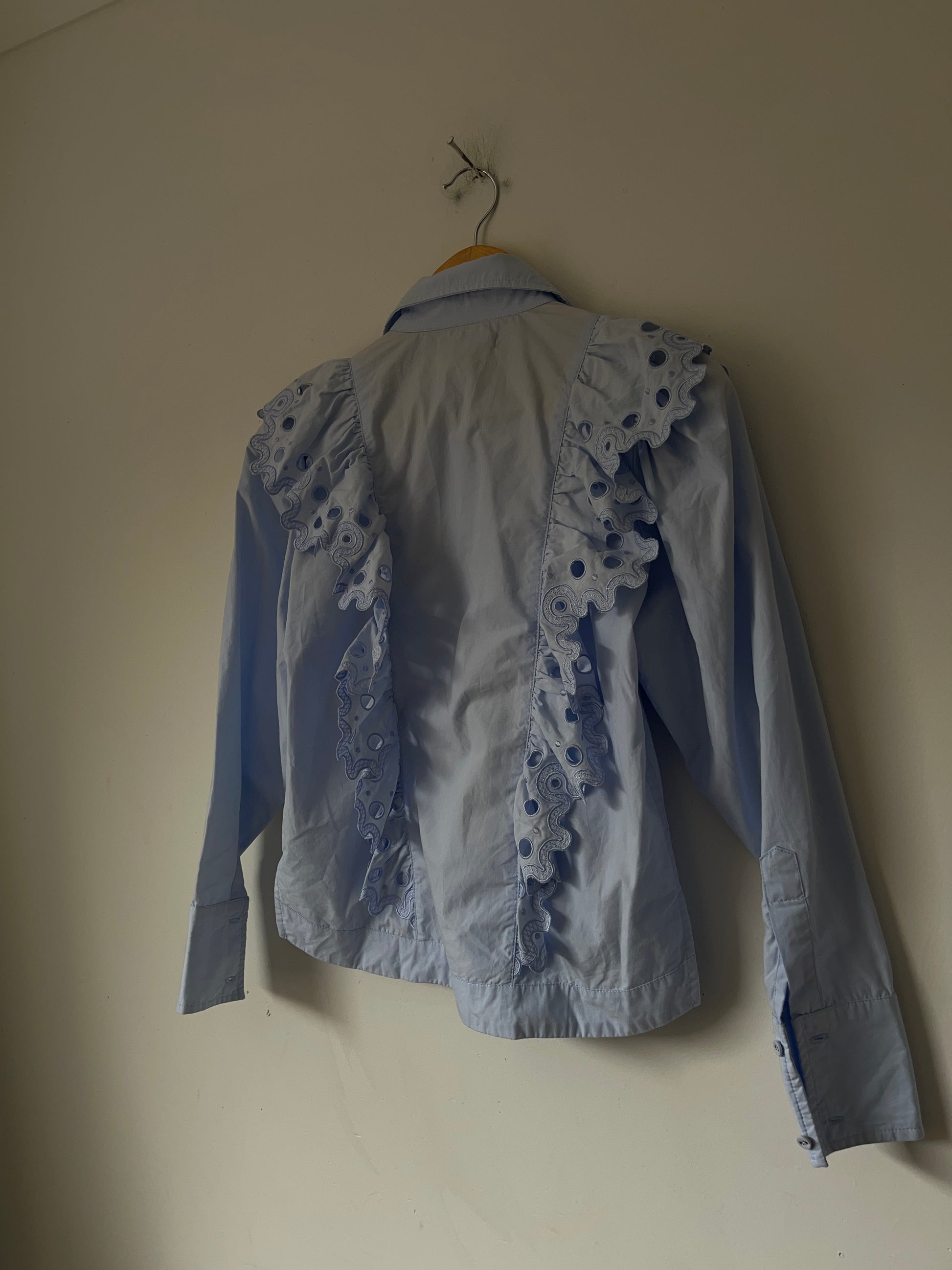 Size imo 6-8. Tagged size XS. RRP$429. MAGDA PAGALI ruffled shirt on eyelet/broderie snglaise. Light blue. Length 55cm. Armpit-armpit 46cm. Composition: cotton. Faults: none