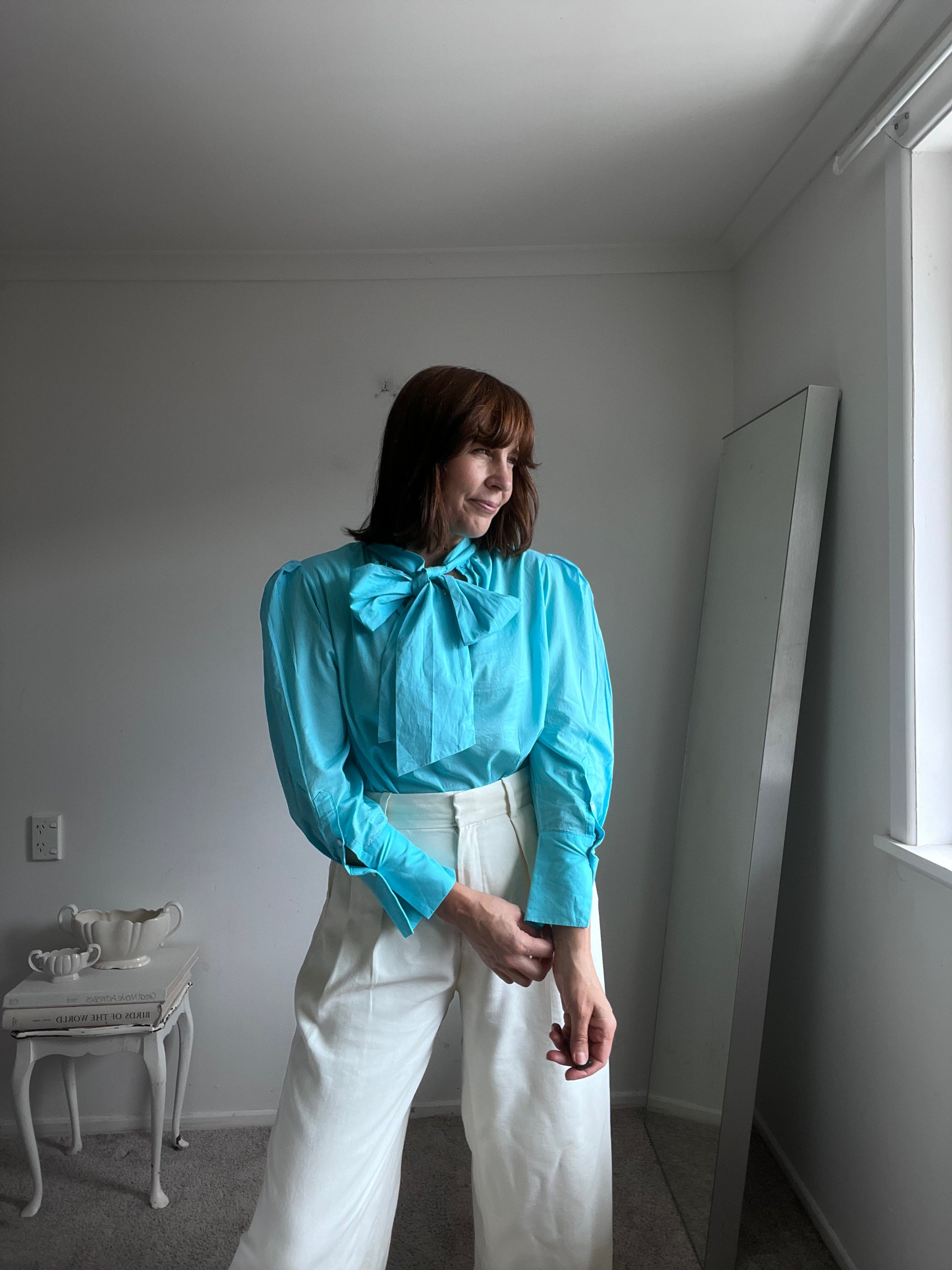 Size imo 8-10. Tagged size 10. RRP$140. Mediterranean blue MAX blouse. I’m pretty sure I have this on backwards! Big puffed shoulder/sleeves. Length 63cm. Armpit-armpit 55cm. Composition: soft cotton Faults: none