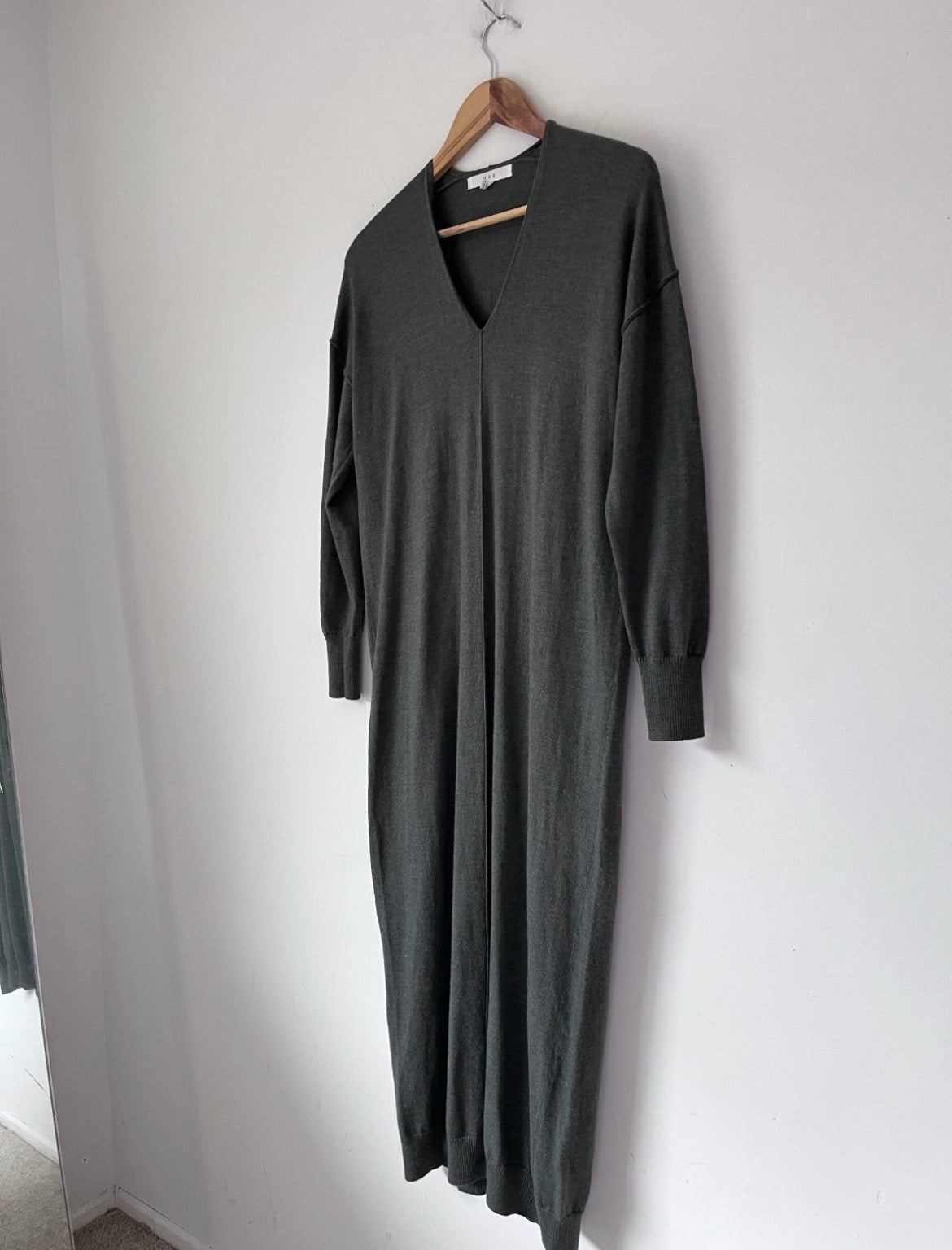 Description: MAX fine merino knit dress. Dark forest green. Modelled shot not actual dress.