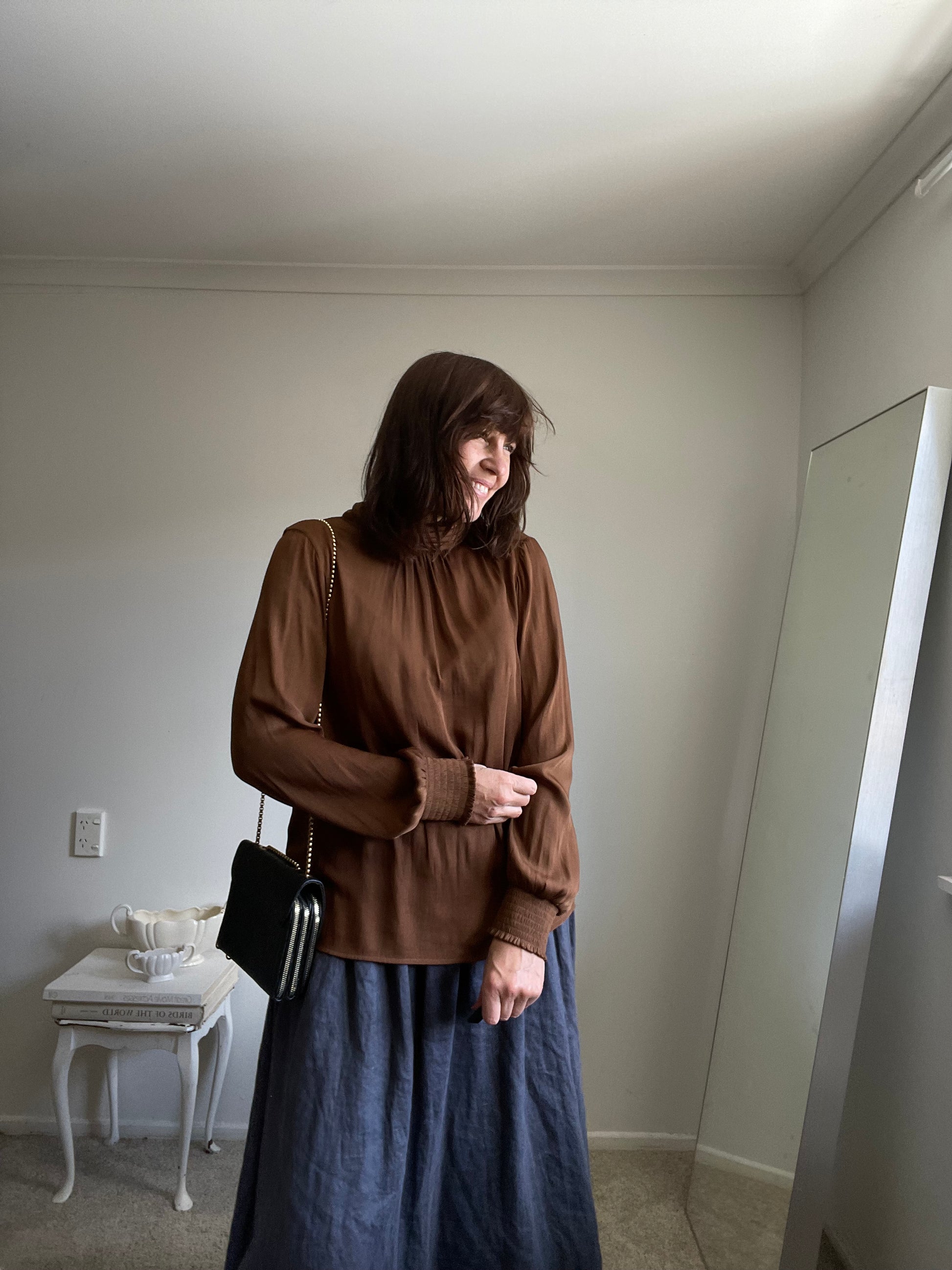 Size 12-16 imo. Tagged size: 16. RRP$149. MAX bronze silky top with high neck and tie. Elastic shirred wide cuffs, blouson sleeves. Length 65cm. Armpit-armpit 52cm. Composition: silky fine polyester