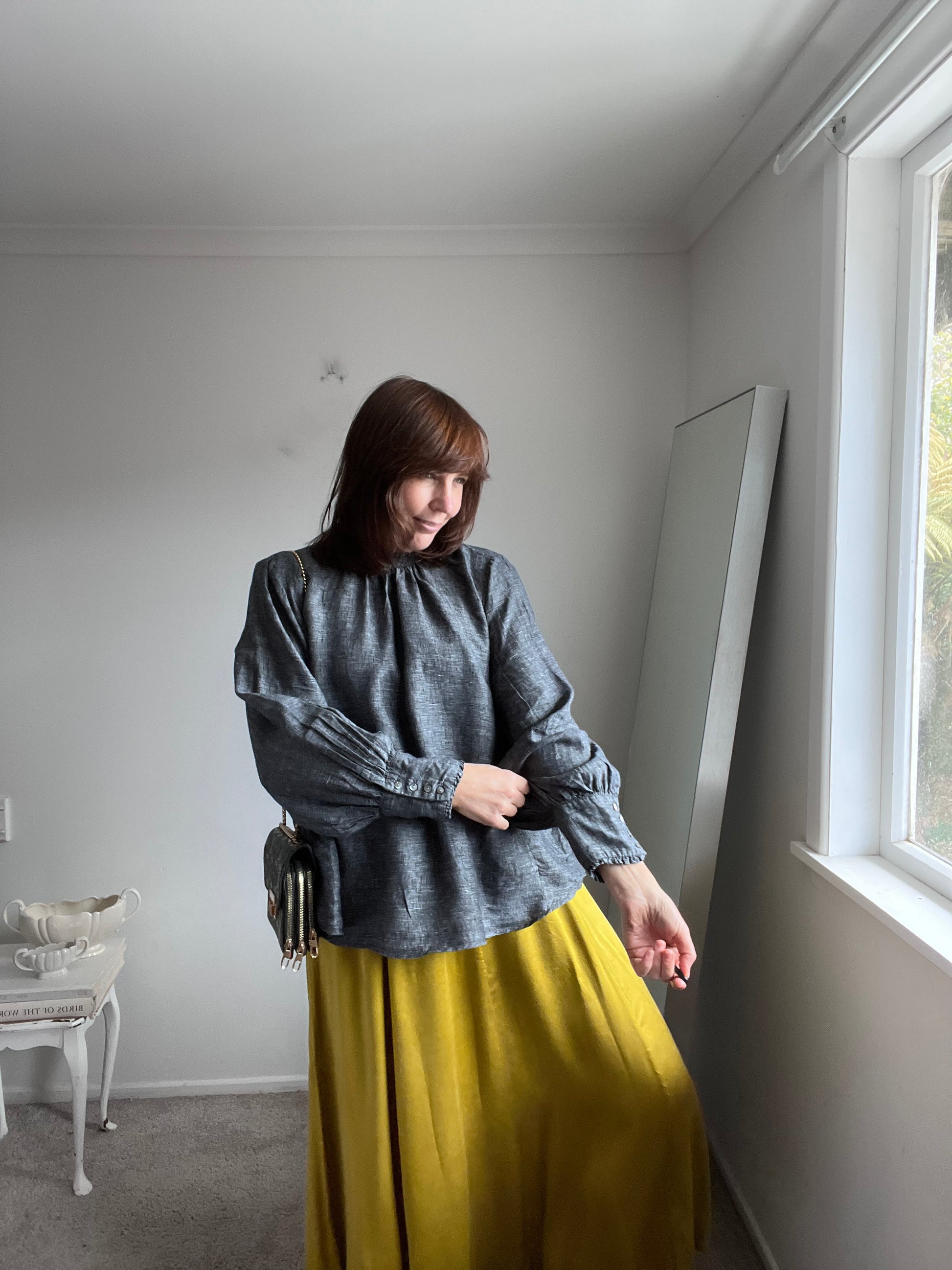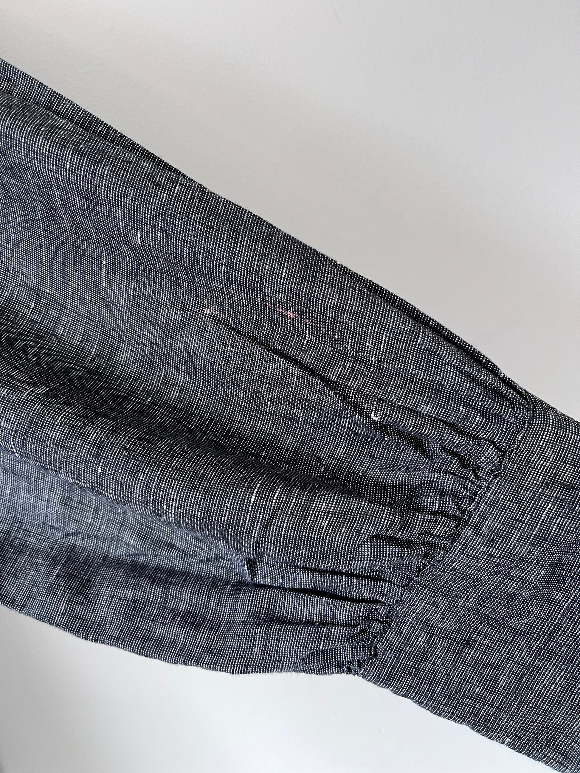 Size 16-18 imo. Tagged size cut. RRP$140. MAX textured linen charcoal blouse with high neck and blouson sleeves. A small reddish mark on one sleeve - pls see pic. Length 63cm. Armpit-armpit 66cm. Composition: linen