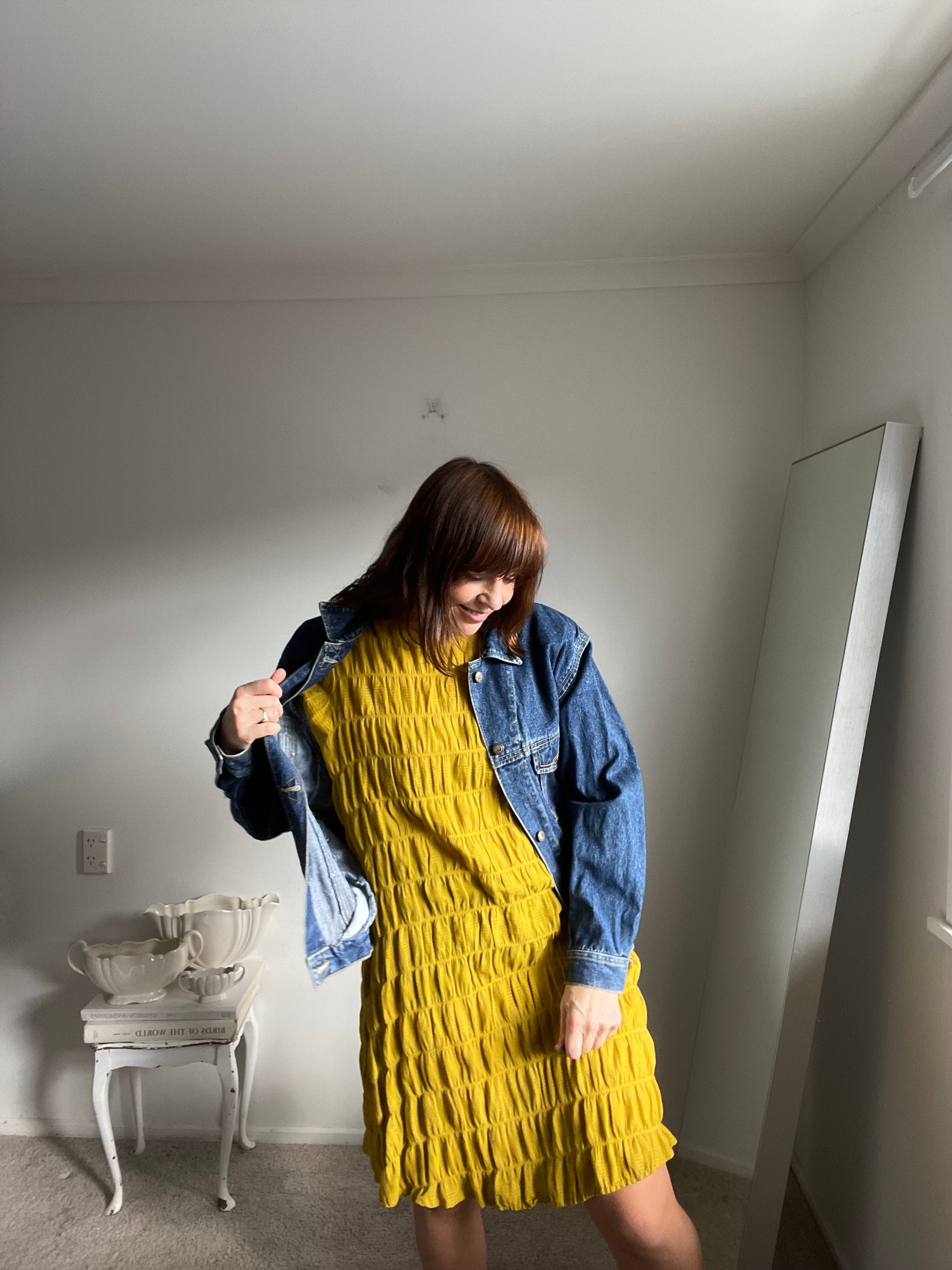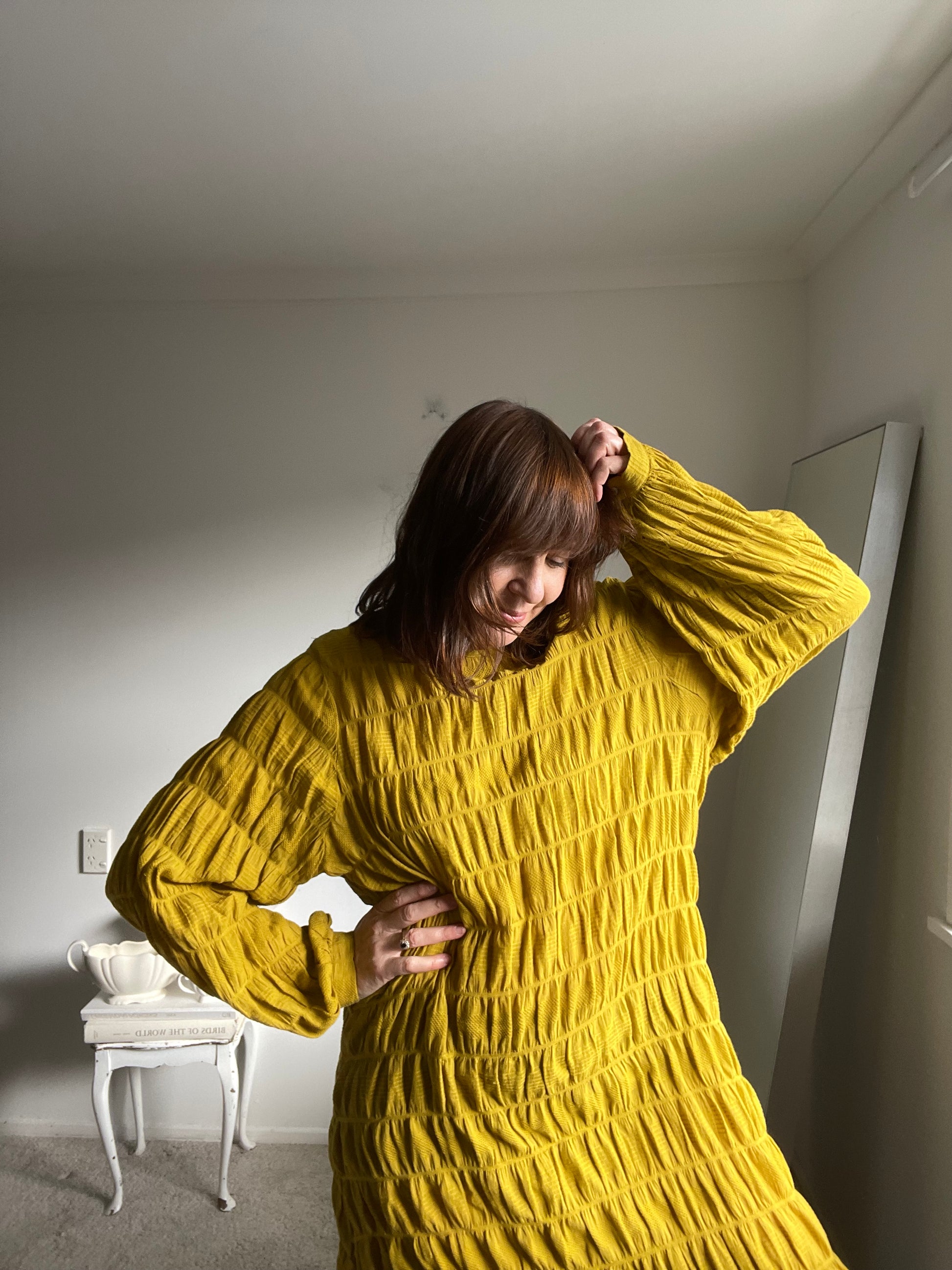 Size 16-18 imo. Tagged 16. RRP$159. MAX textured dress in gold/mustard. Length 95cm. Armpit-armpit 60-70cm easy stretch. Composition: 99% cotton, 1% elastane