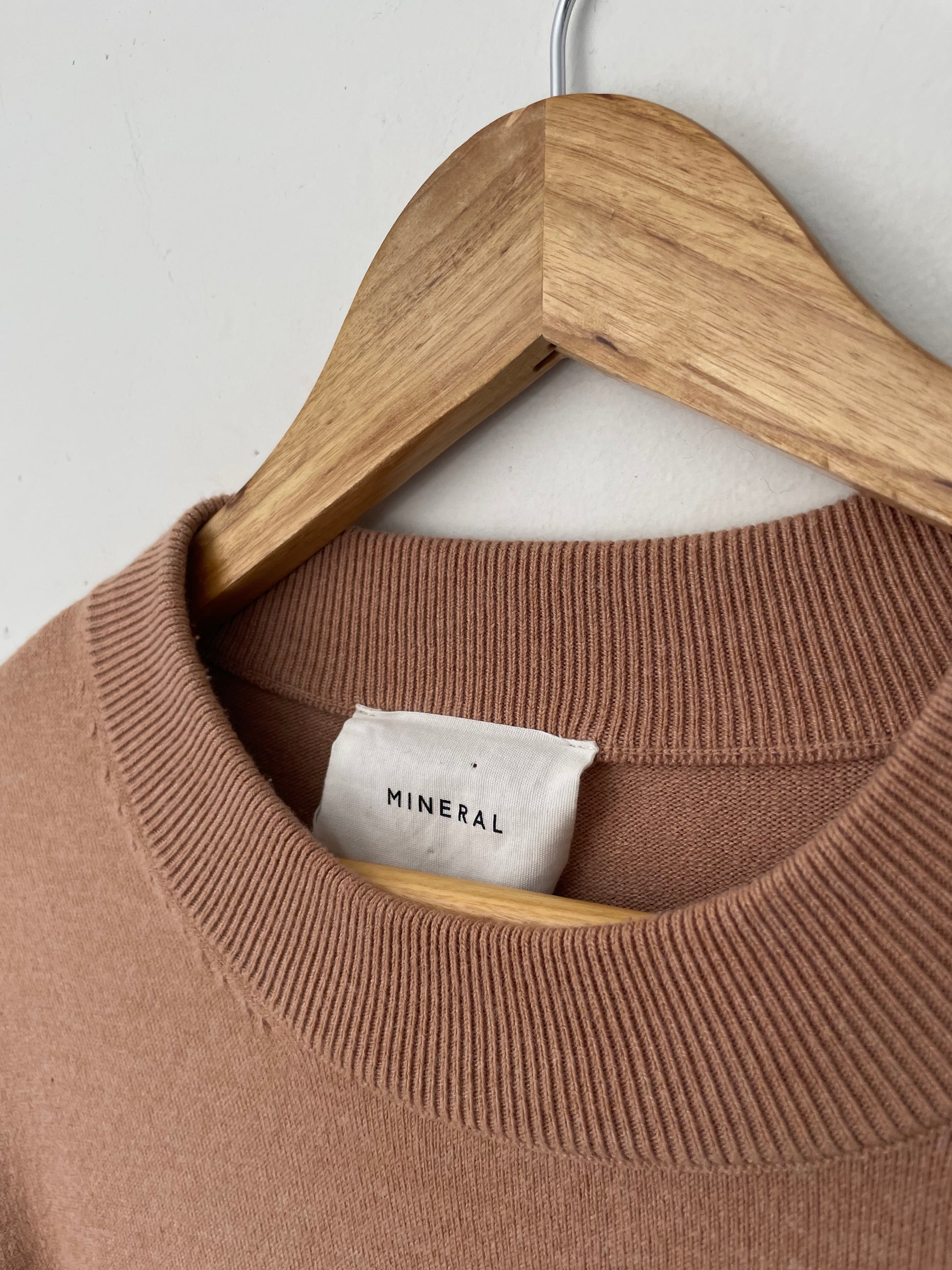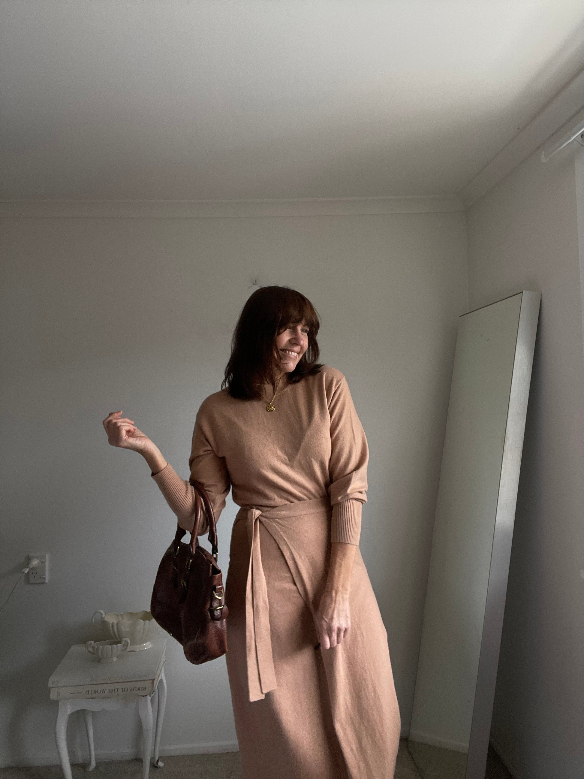 Size 12-14imo. Tagged size M. RRP$140. Camel MINERAL faux wrap dress. Length 128cm. Armpit-armpit 50-54cm gentle stretch. Composition: 43% cotton, 26% nylon, 25% polyester, 5% wool, 1% elastane