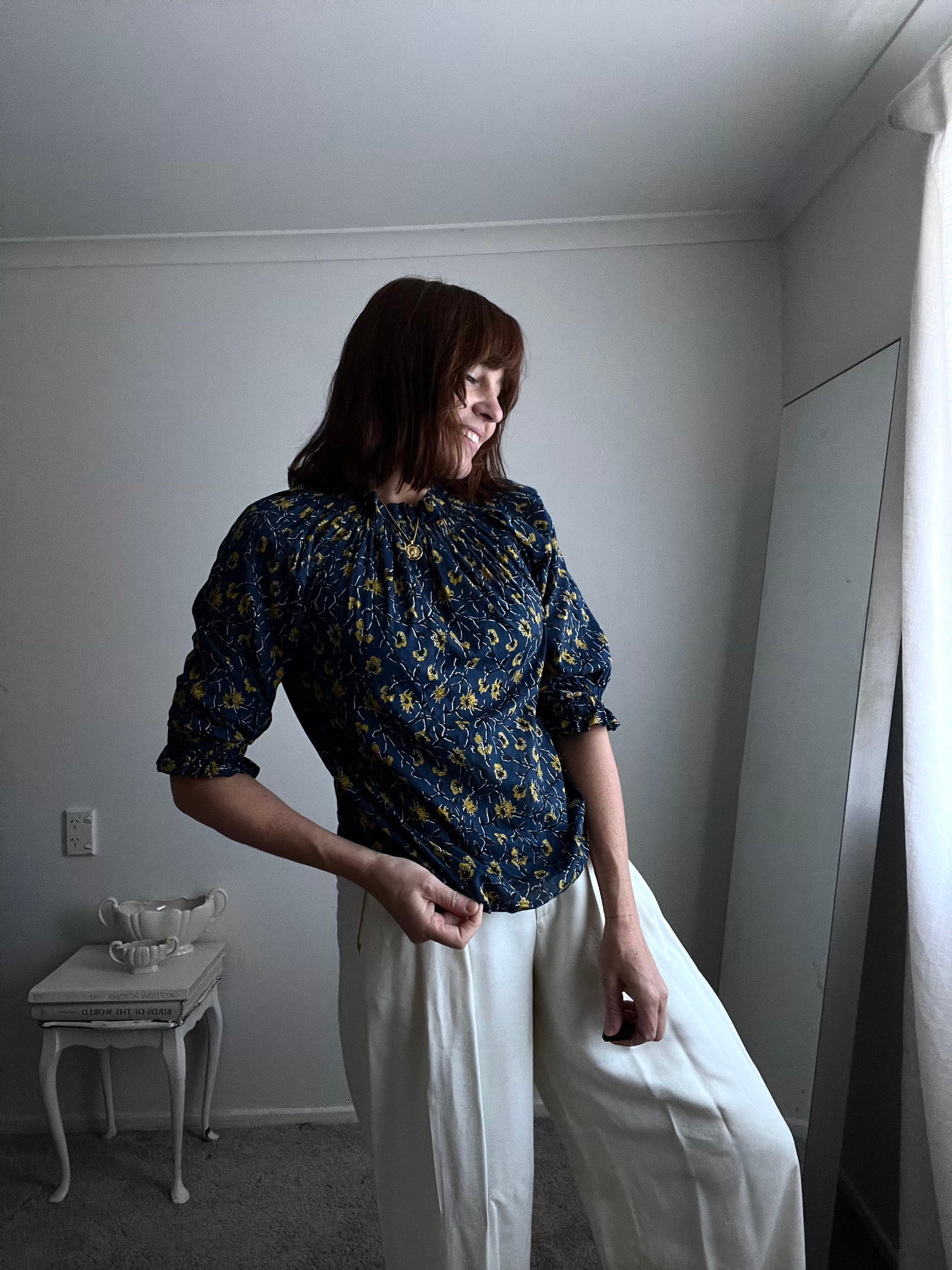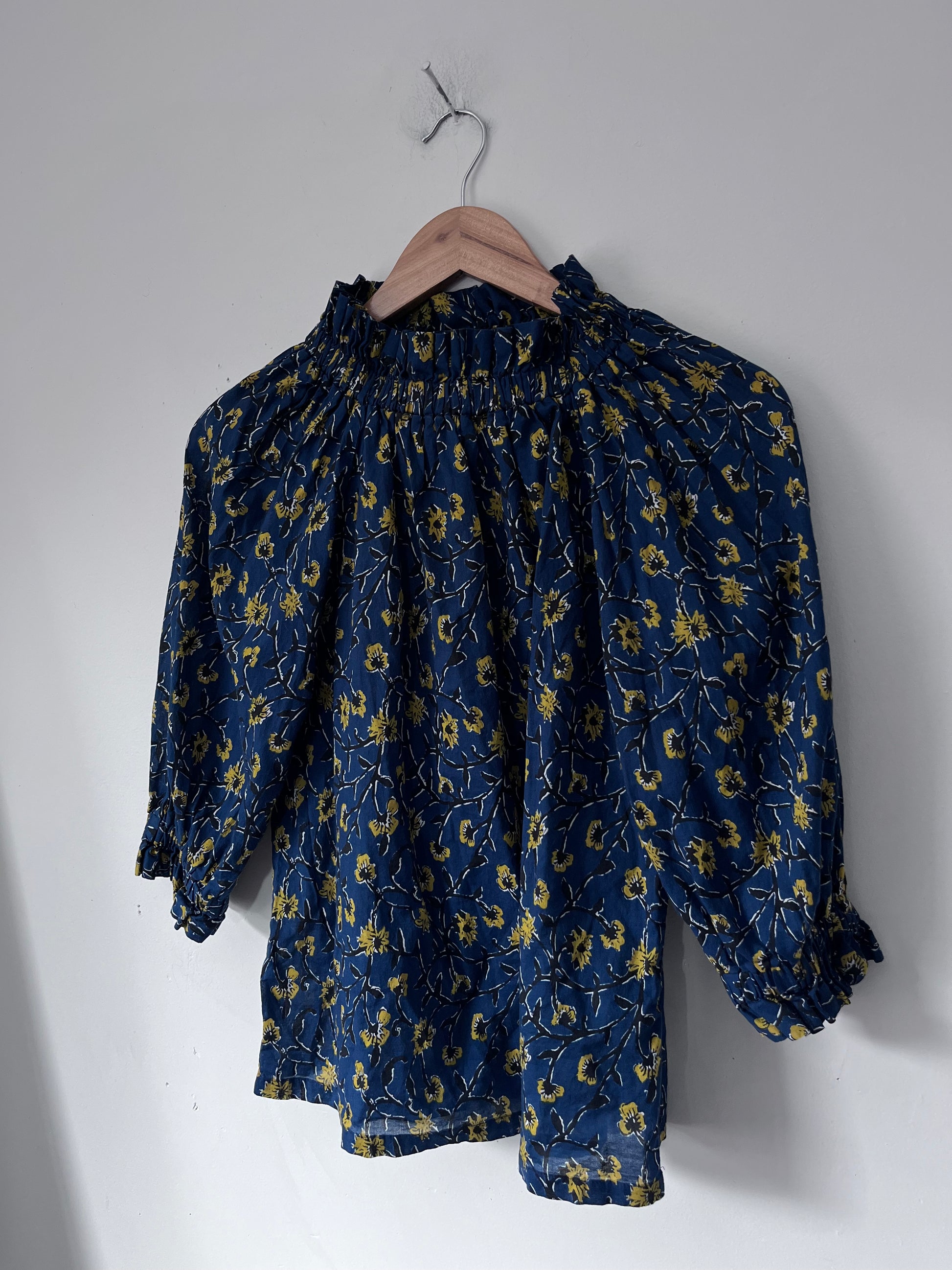 Size imo: 8. Tagged size: XS. RRP$300 approx. MUSE THE LABEL blue blouse with yellow floral, high elasticated neckline and cuffs. Length 60cm. Armpit-armpit 50cm. Composition: cotton. Faults: none