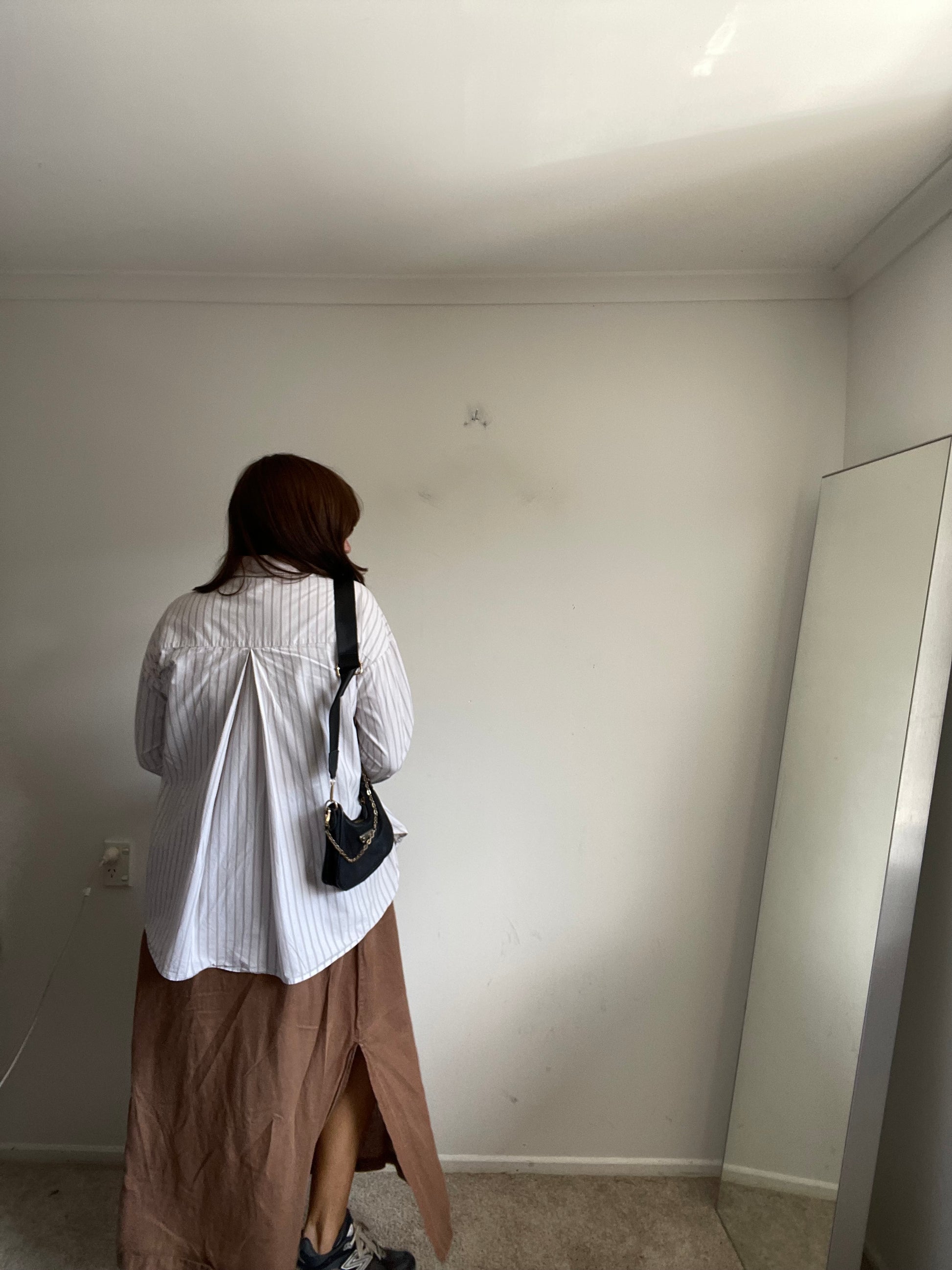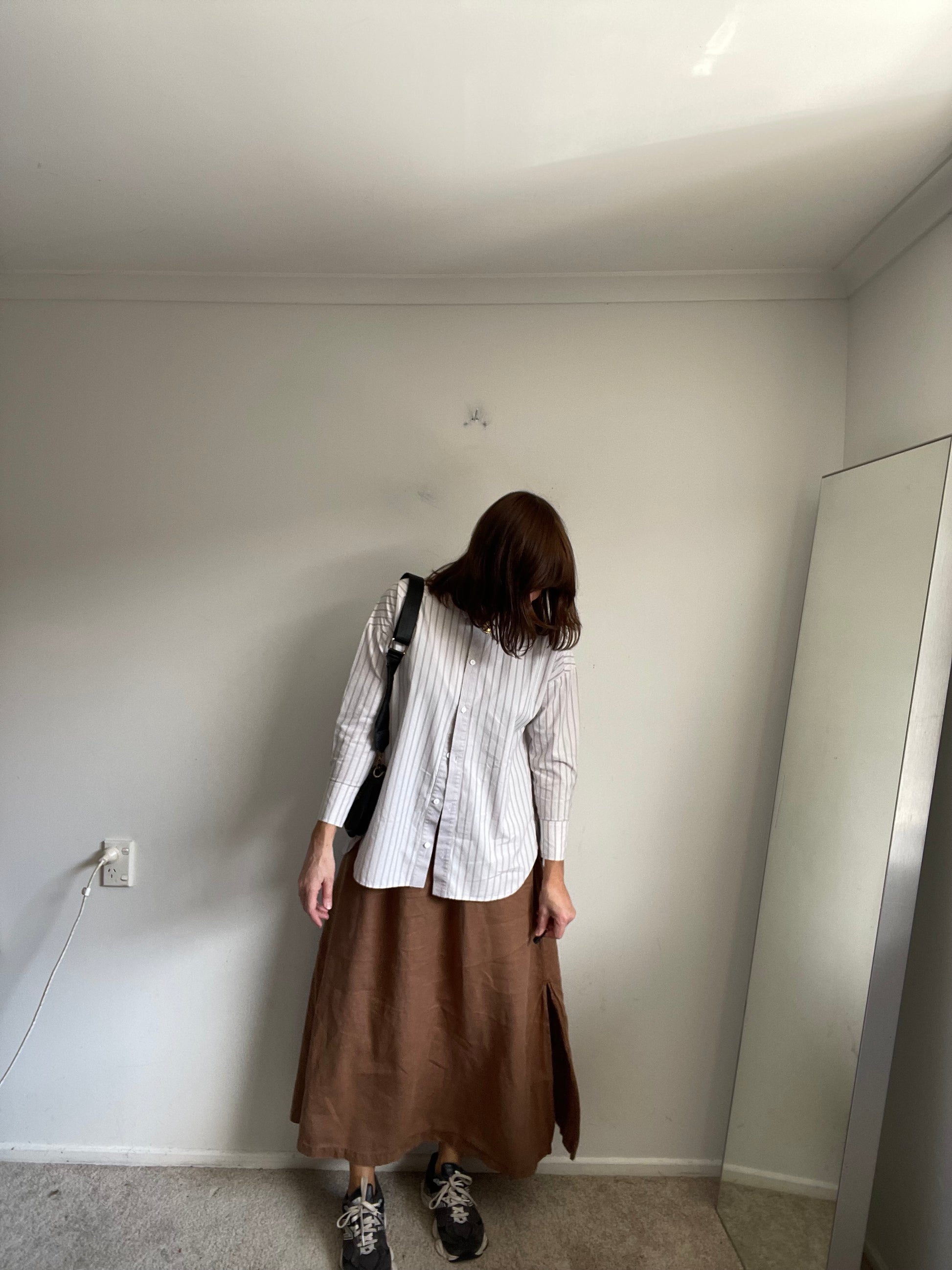 Size 8 imo. Tagged 8. RRP$280. NYNE pinstripe shirt. Drop shoulder fit. Back pleat. Length 69cm. Armpit to armpit 57cm. Composition: cotton. Made in NZ.