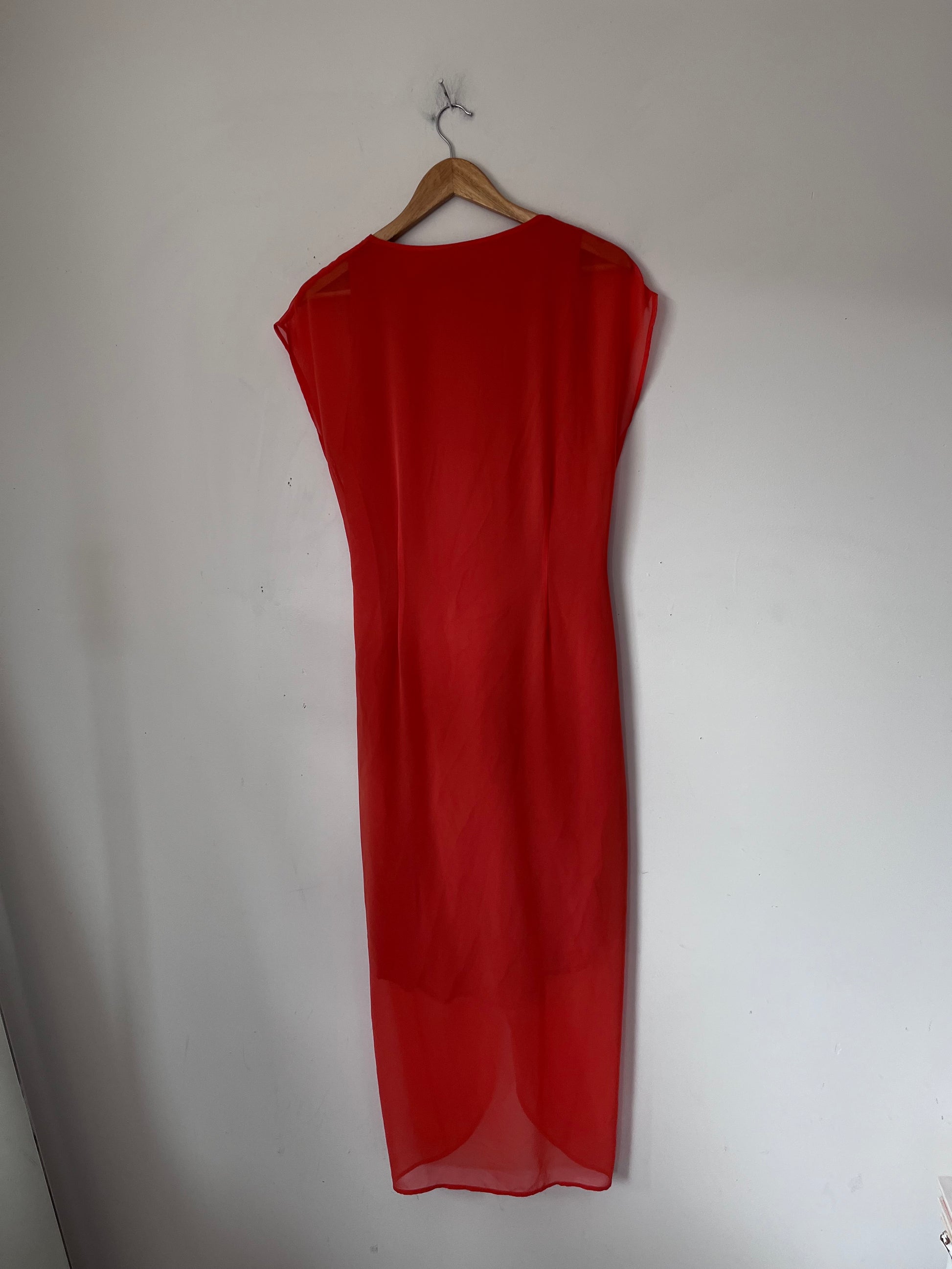 Size imo: 8. Tagged size: 8. RRP$389. REPERTOIRE 'La Mer' dress, tie front, v-neck. Lined. Length 127cm. Armpit-armpit 48cm. Composition: polyester. Faults: none