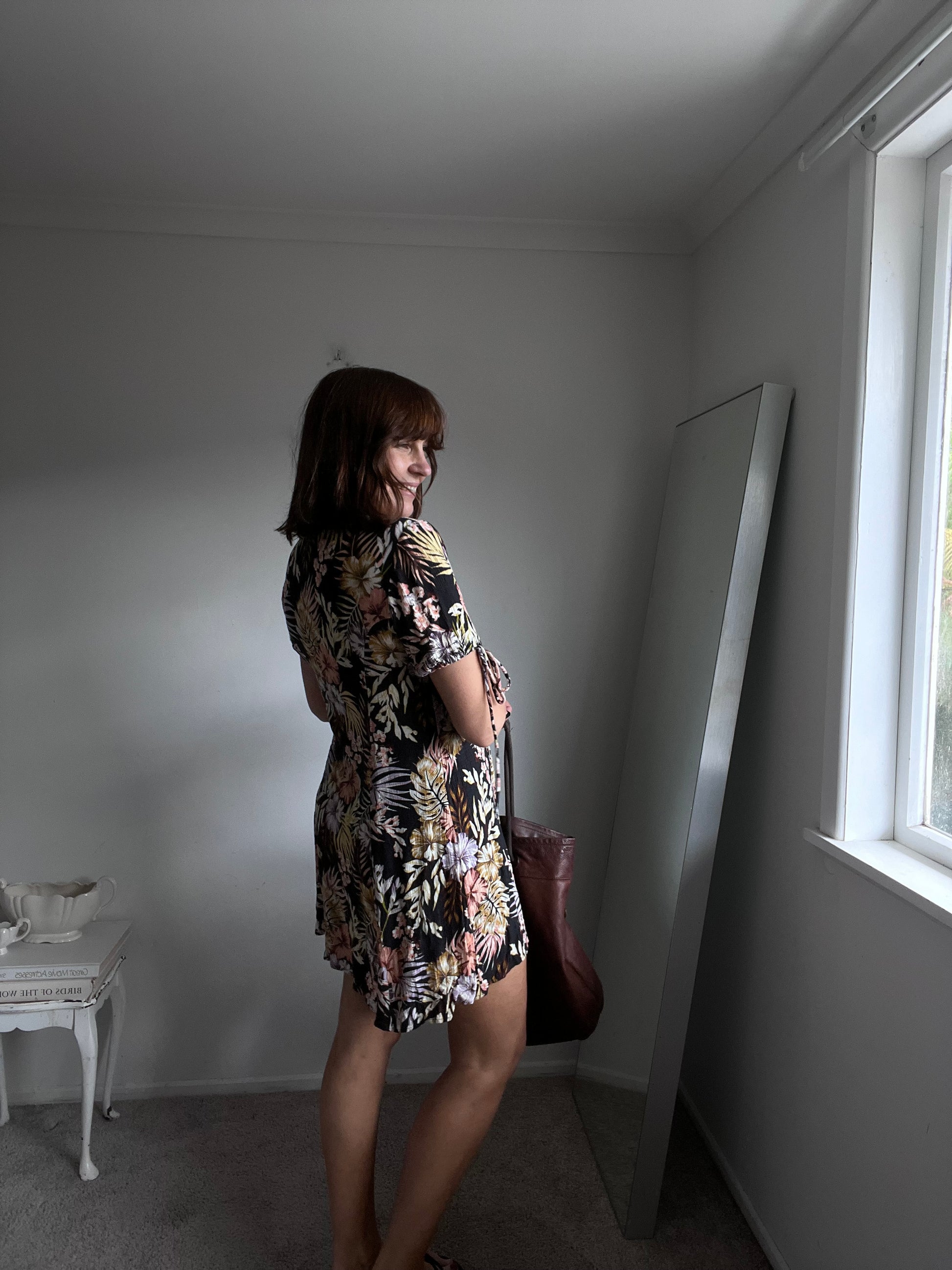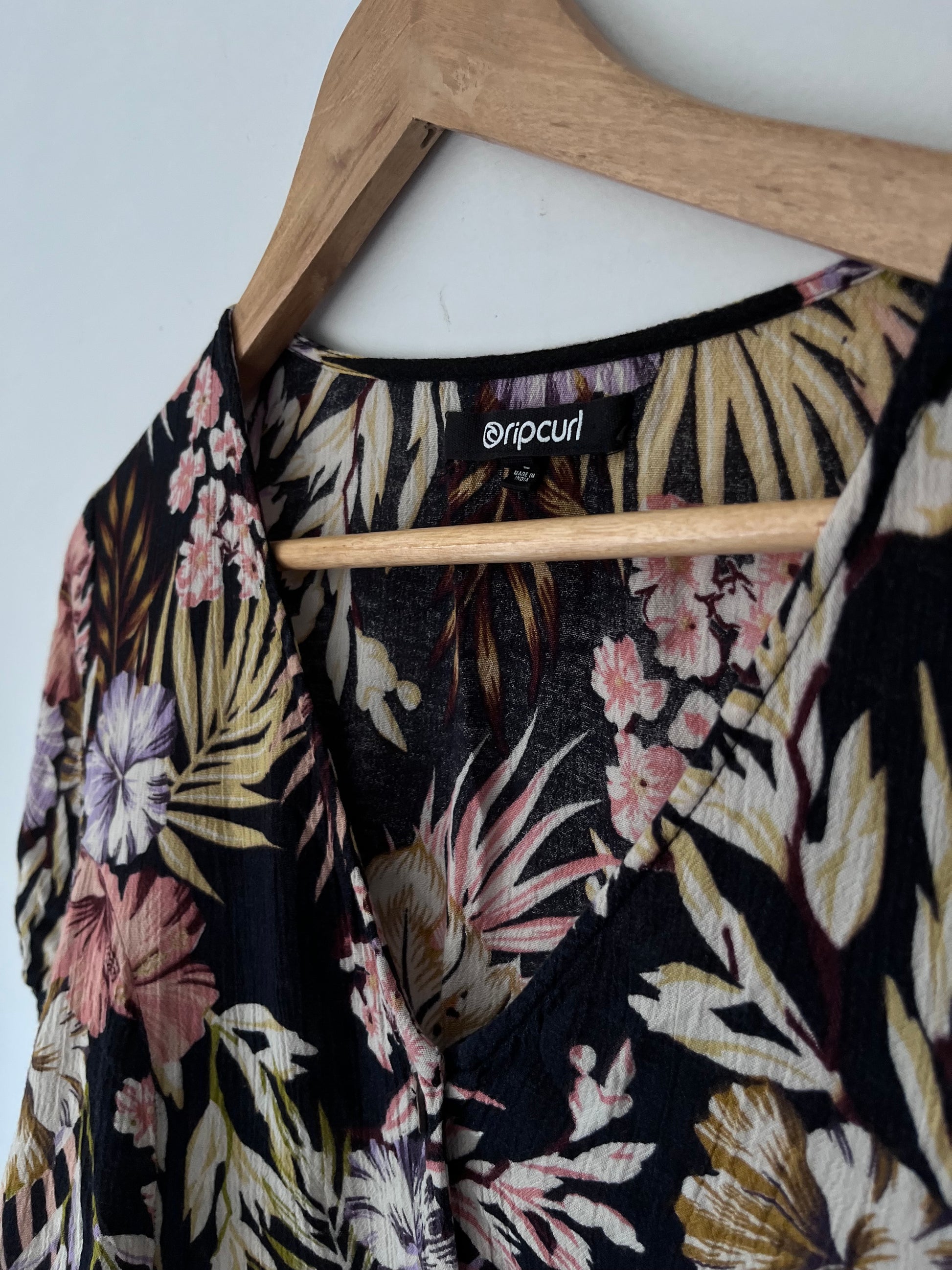 Size imo 12. Tagged Size: L. Black botanical surfy dress by RIPCURL. Ties at sleeves. Button down. Length 86cm. Armpit to armpit 50cm. Composition: soft viscose.