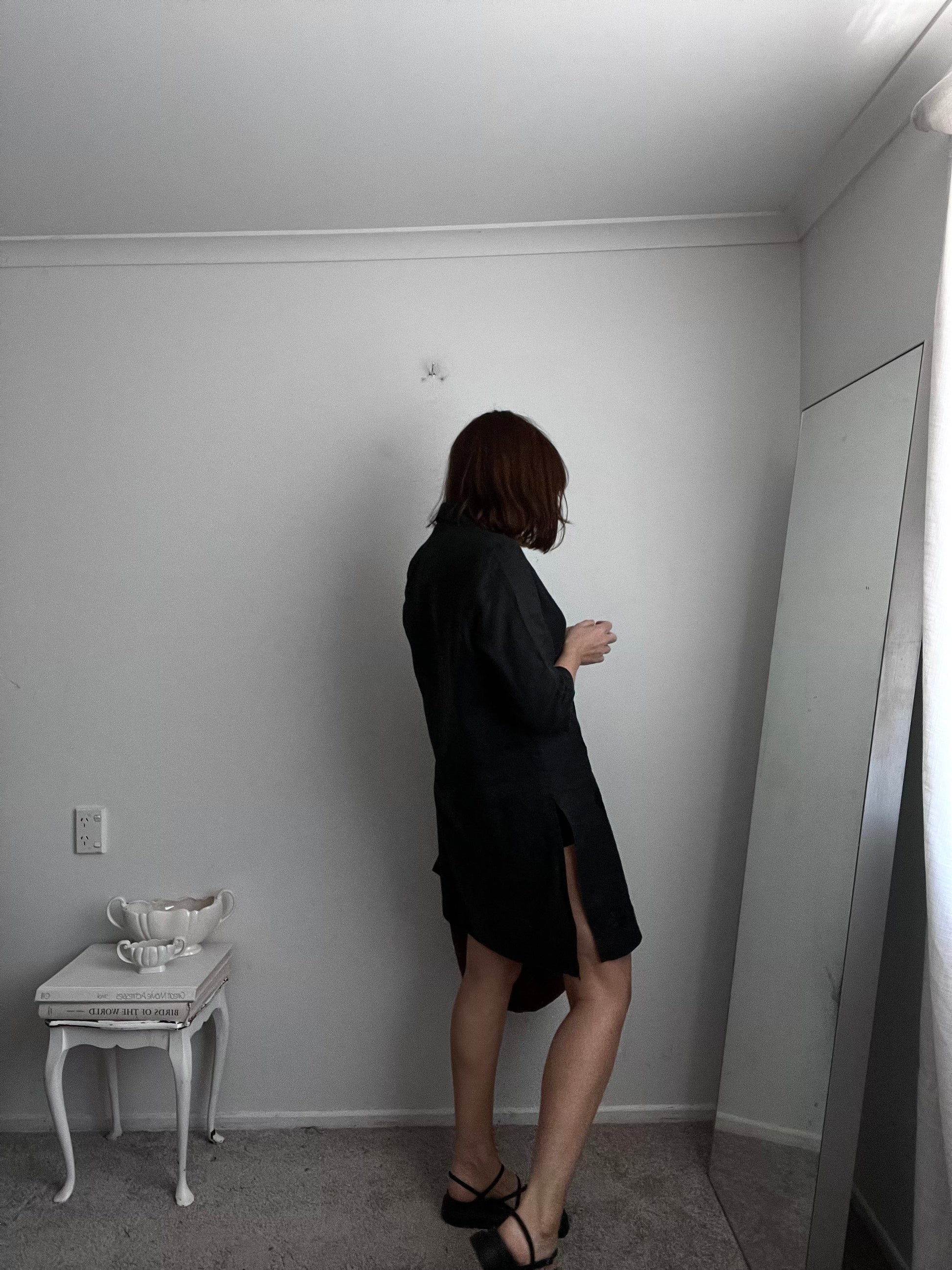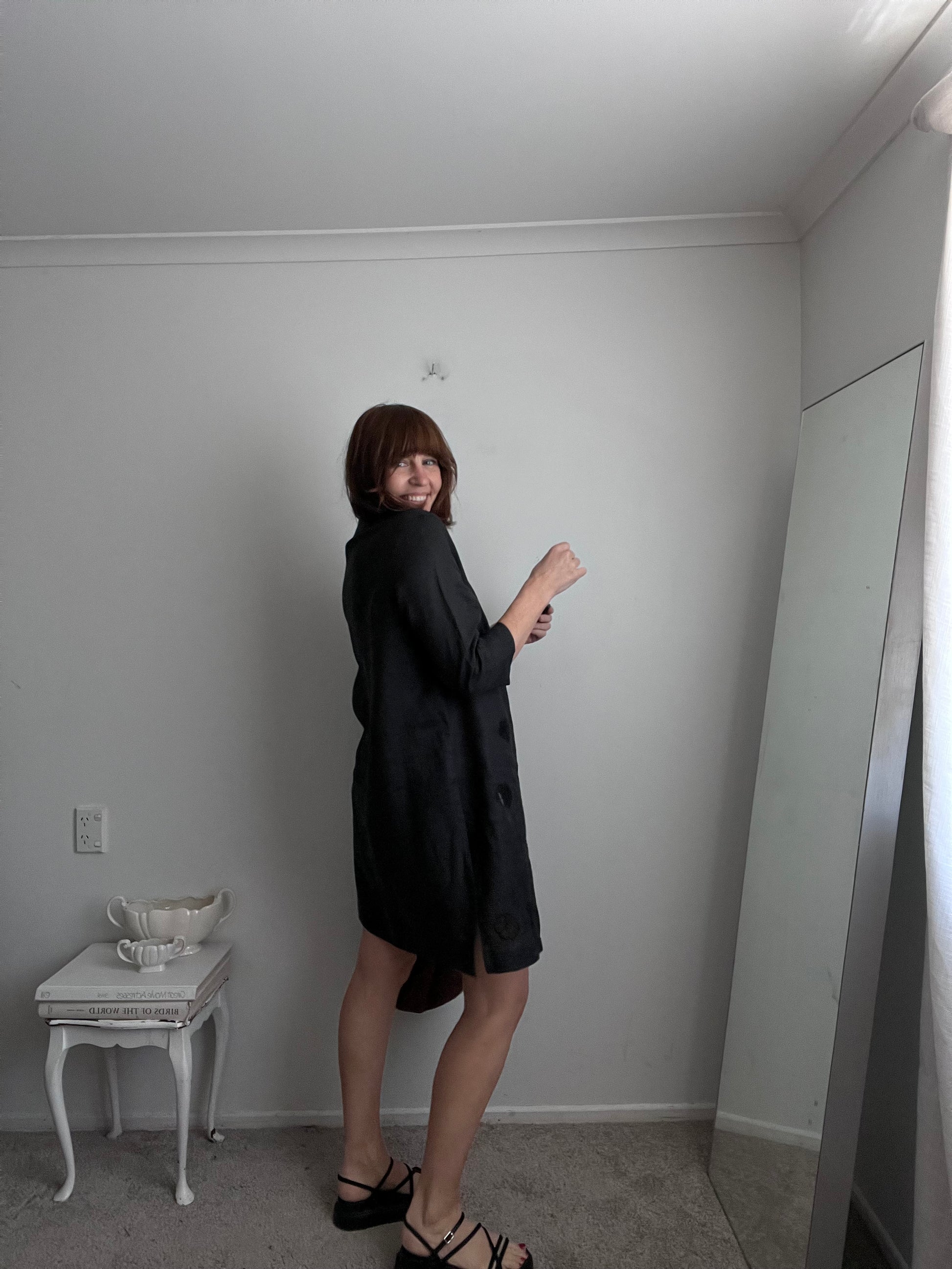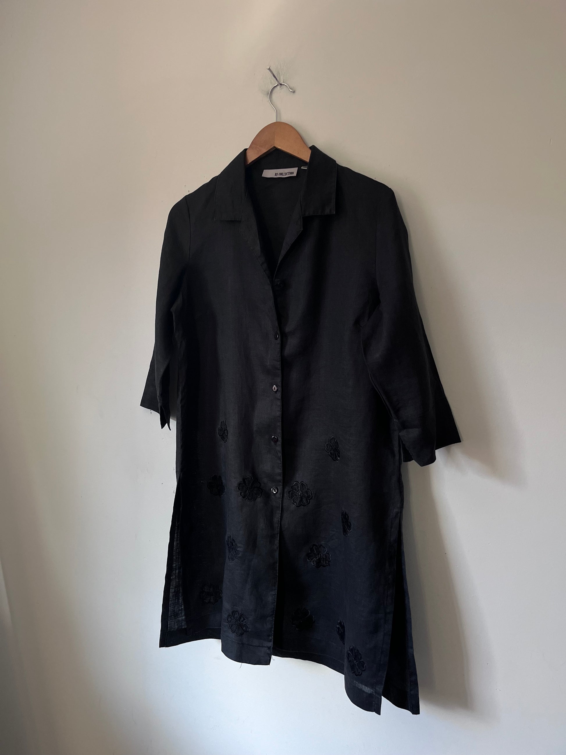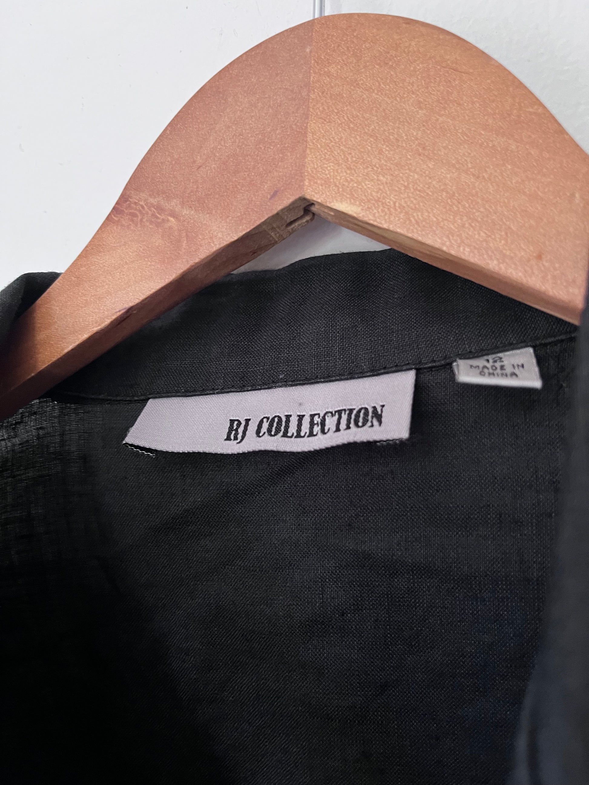 Size imo: 8-10. Tagged size: 12. RJ COLLECTION black ramie shirt/coverup. Perfect for over a swimsuit. Little cut out floral details bottom third of dress. Splits at side. Length 90cm. Armpit-armpit 53cm. Composition: ramie. Faults: none