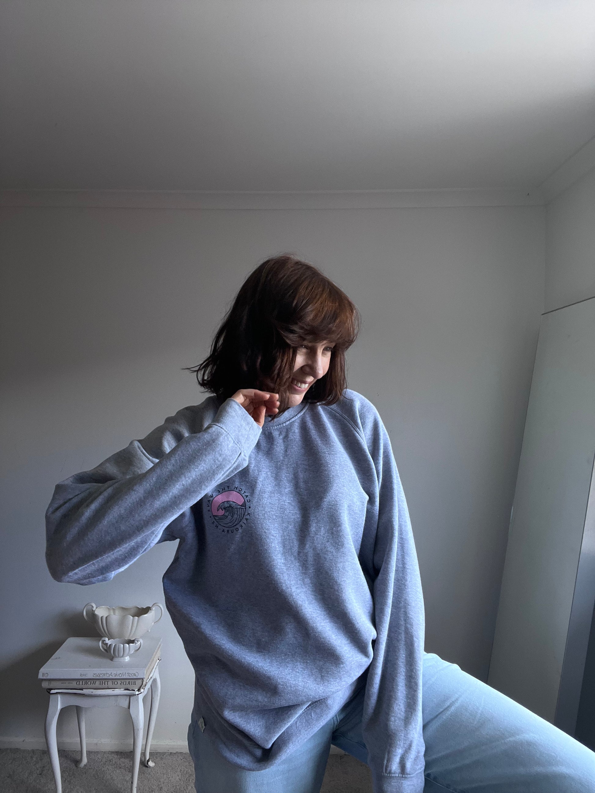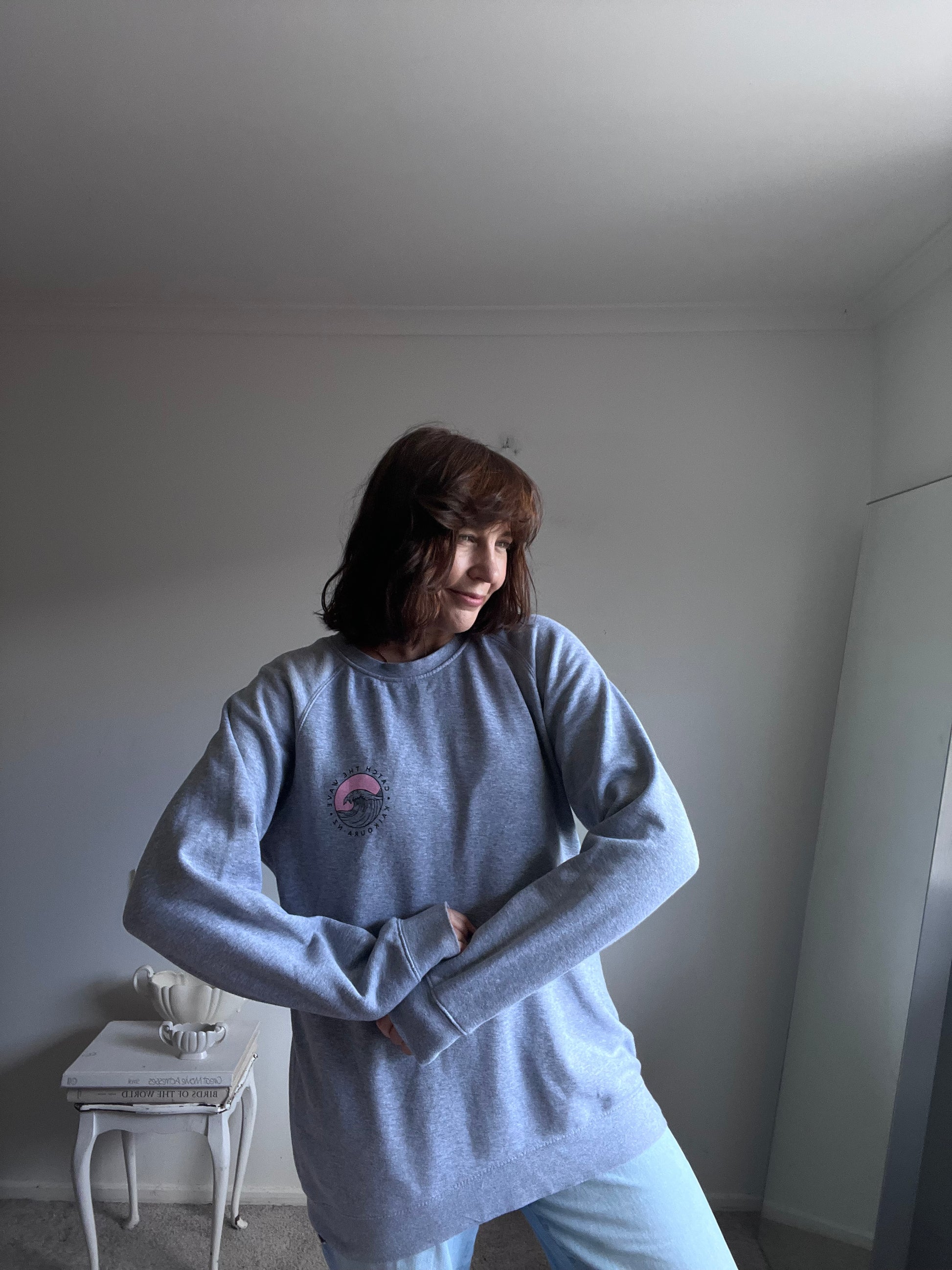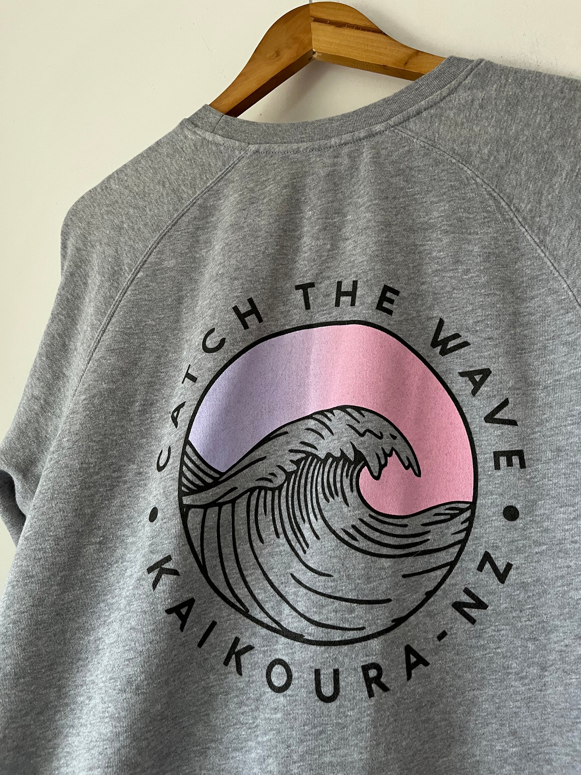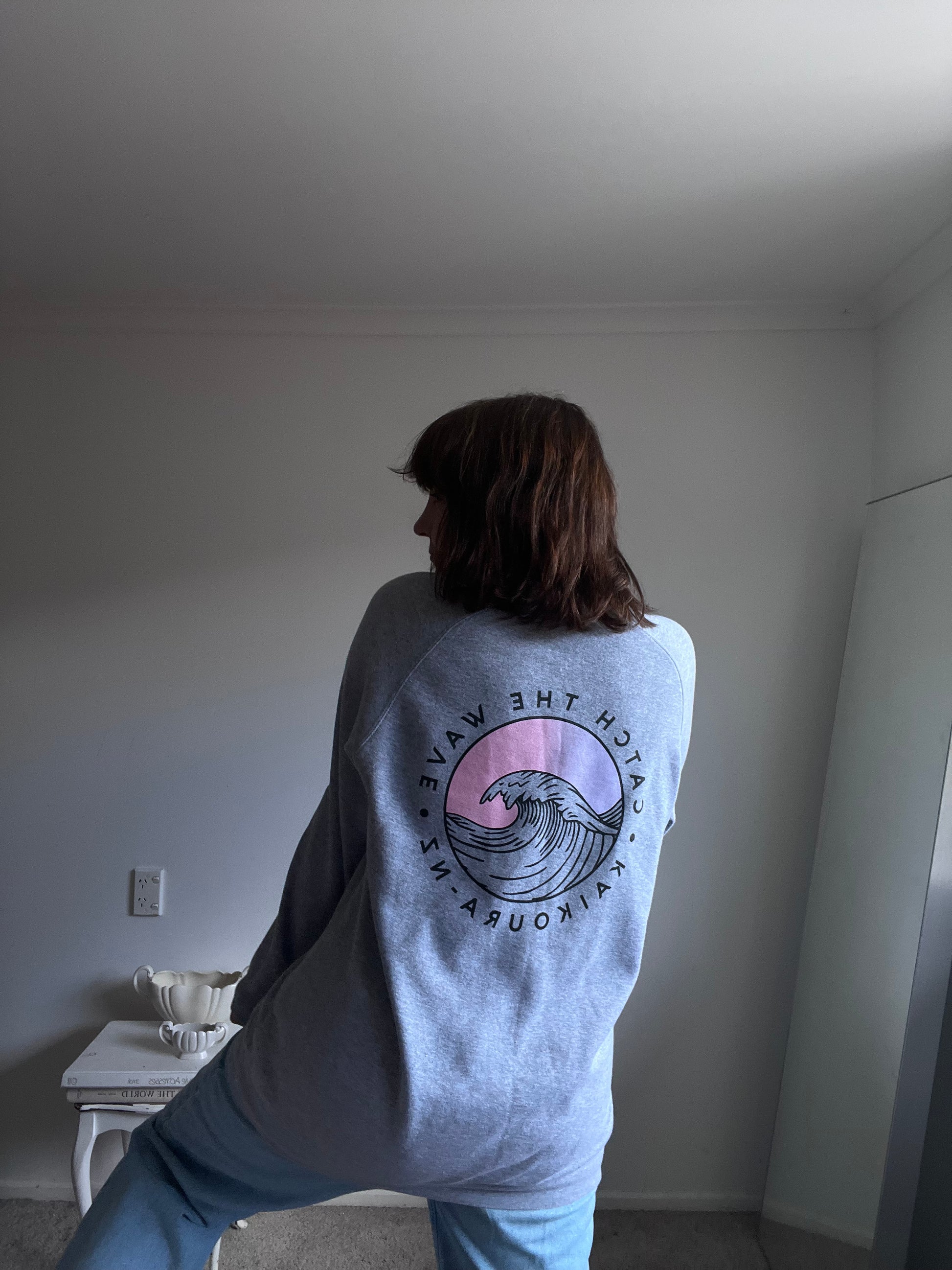Size imo: 8-12. Tagged size: L. RRP$115. ROAM 'Catch the Wave' surf jumper. Splash back. Length 73cm. Armpit-armpit 57cm. Composition: cotton. Faults: none