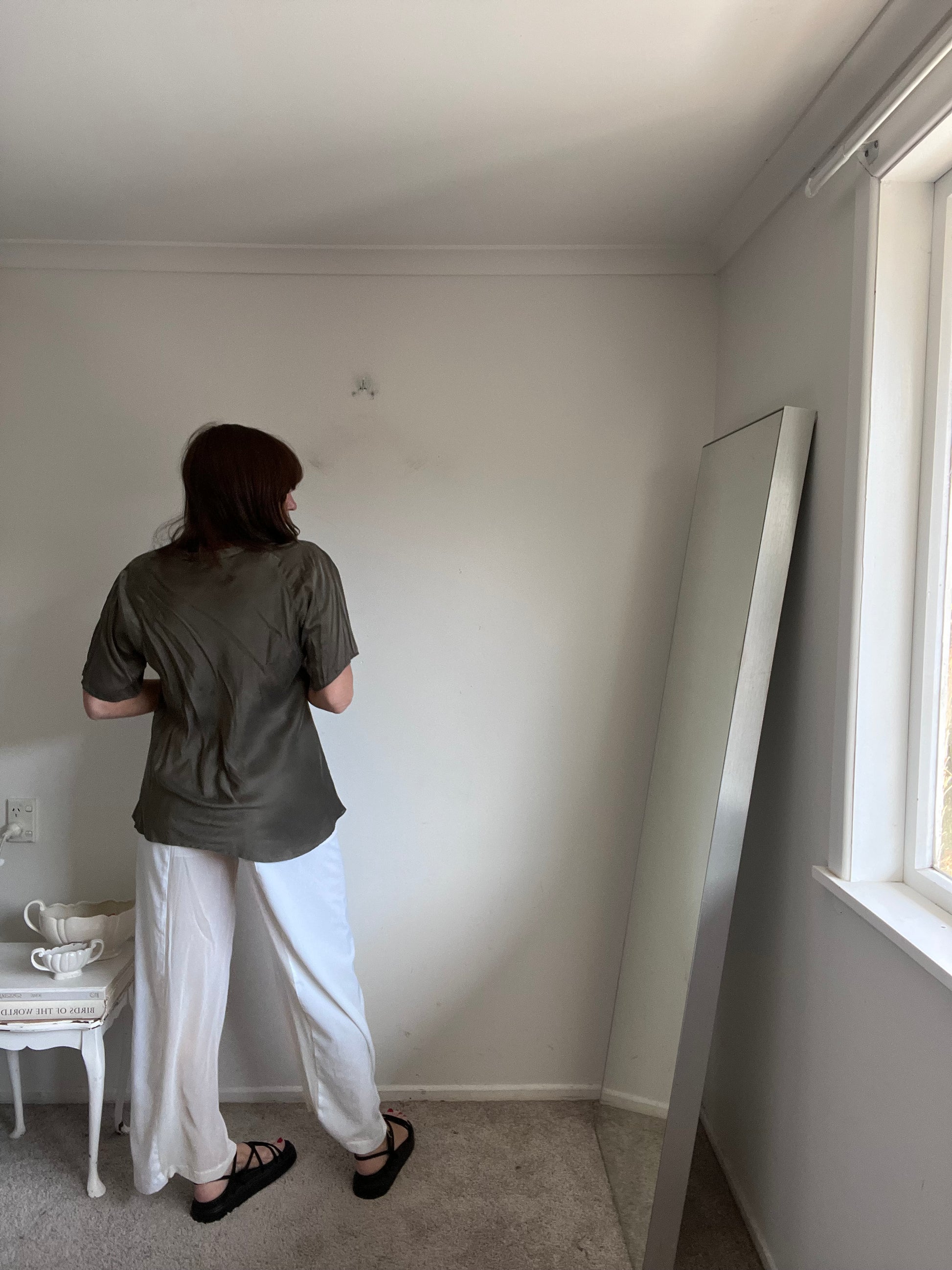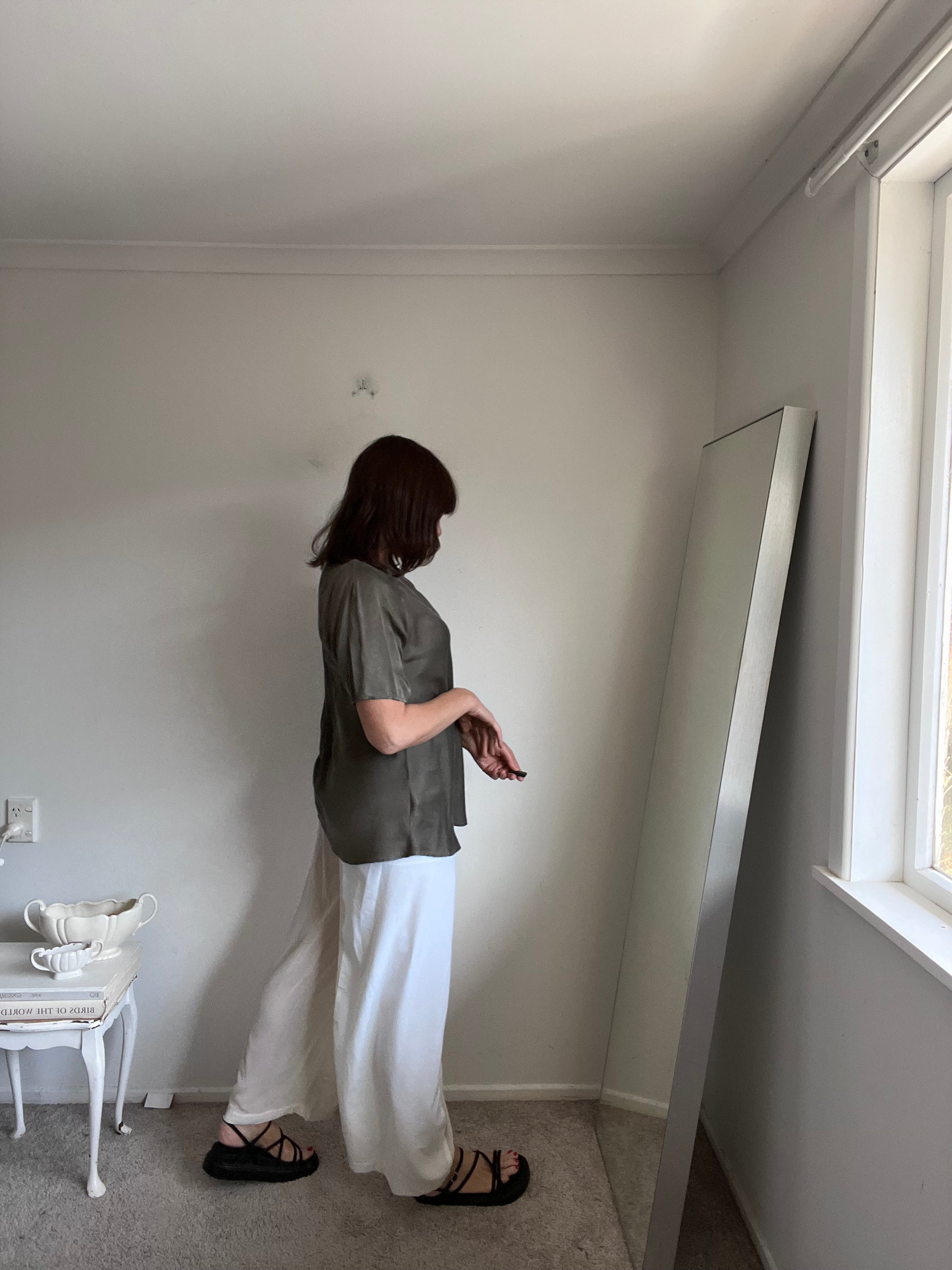 Size 10-12imo. Tagged size L. RRP$. WENDY NELSON cream pants with silk inserts. Very high waisted and fitted around bum/top of thighs, flowing out to a straight/wide leg. Silk lining 'shorts'. Made in NZ. Length 109cm. Rise 37cm. Waist 78-80cm easy stretch. Composition: silk panels and lining with viscose panels.