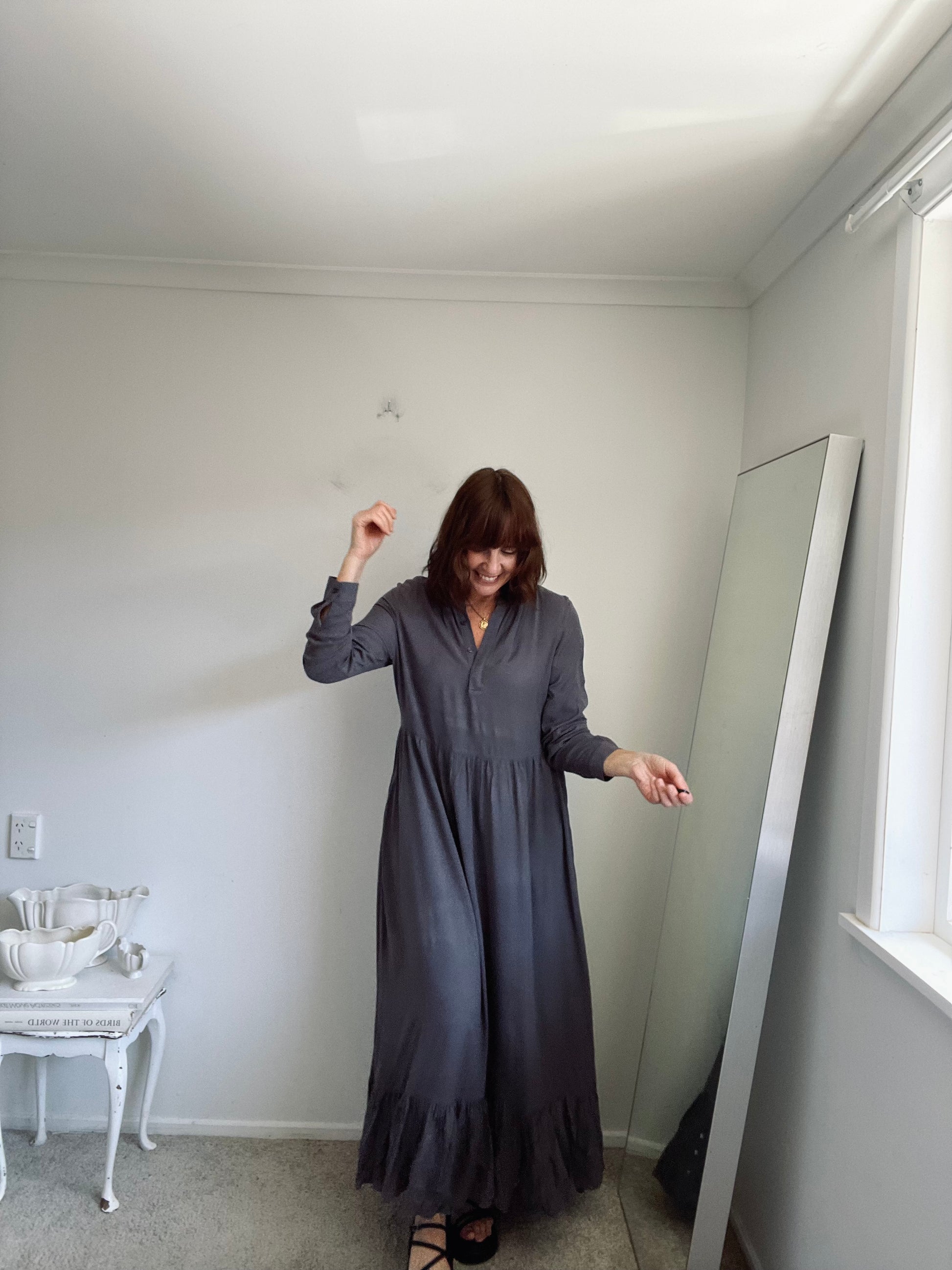 Size 12 imo. Tagged 12. RRP$189. Description: STELLA + GEMMA 'Greenwich' dress in Mushroom. Length 145cm. Armpit-armpit 155cm. Composition: viscose - matte