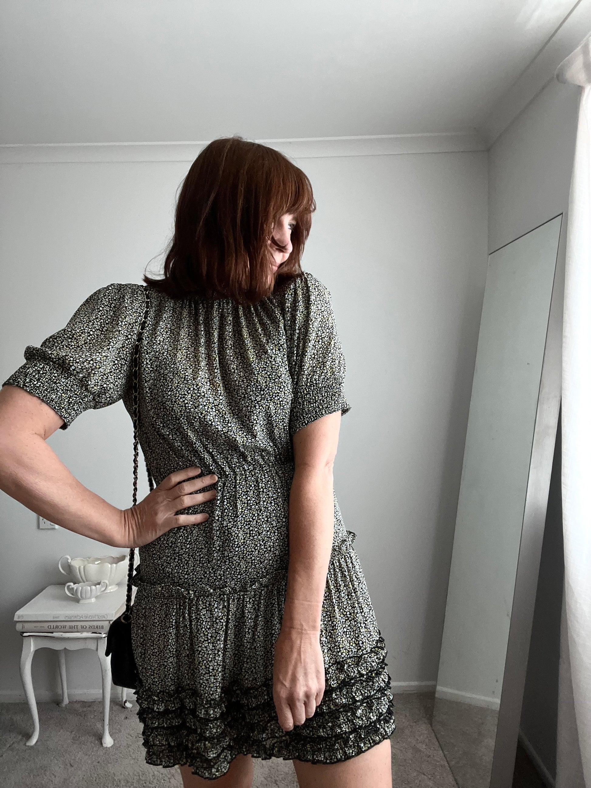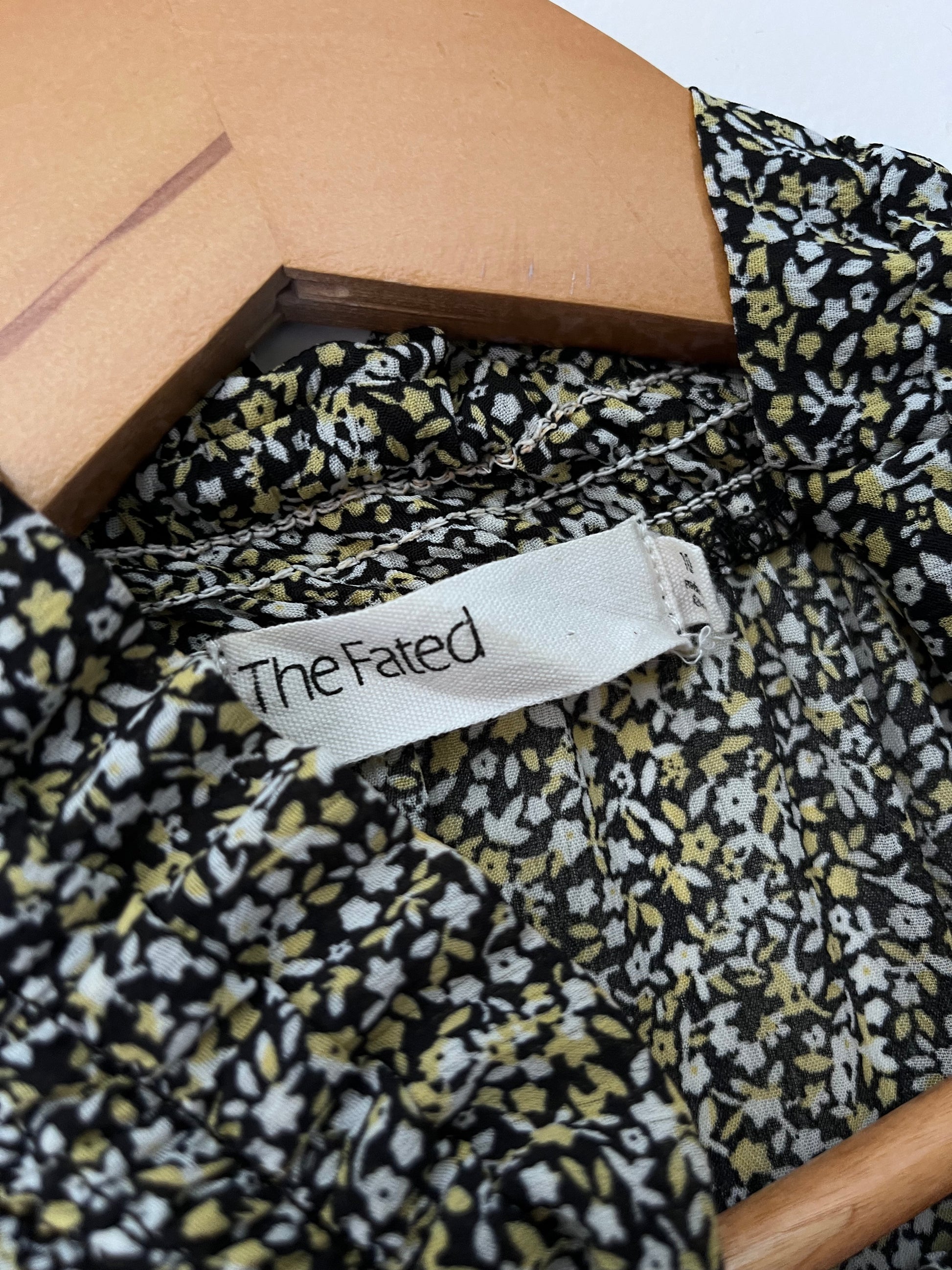 Size imo: 8-10. Tagged size: 10. RRP$. Cute mini dress by FATED. Black and ditsy floral. Ruffle hem, shirred cuffs & high neck. Length 85cm. Armpit-armpit 49cm. Composition: polyester. Faults: none