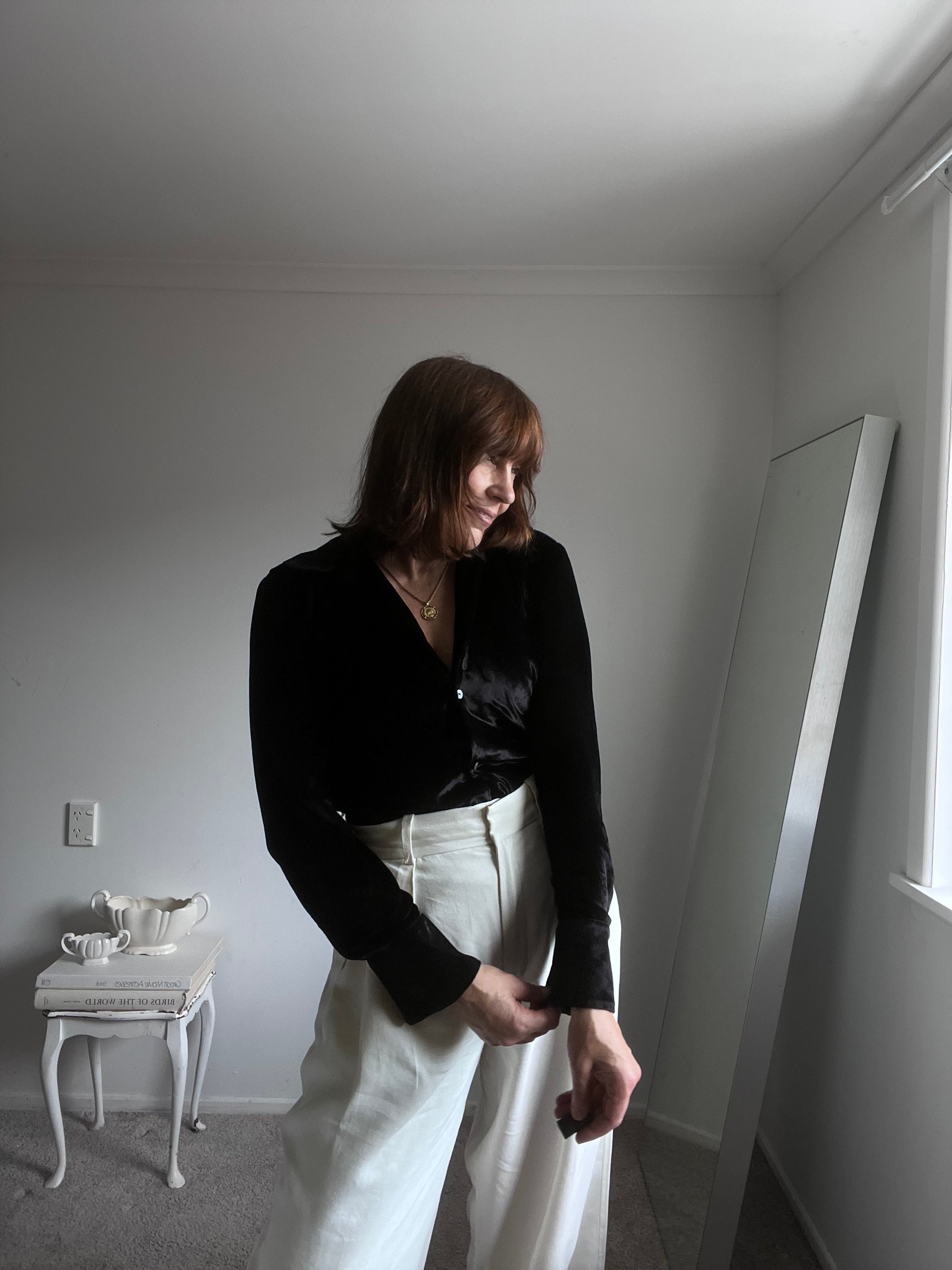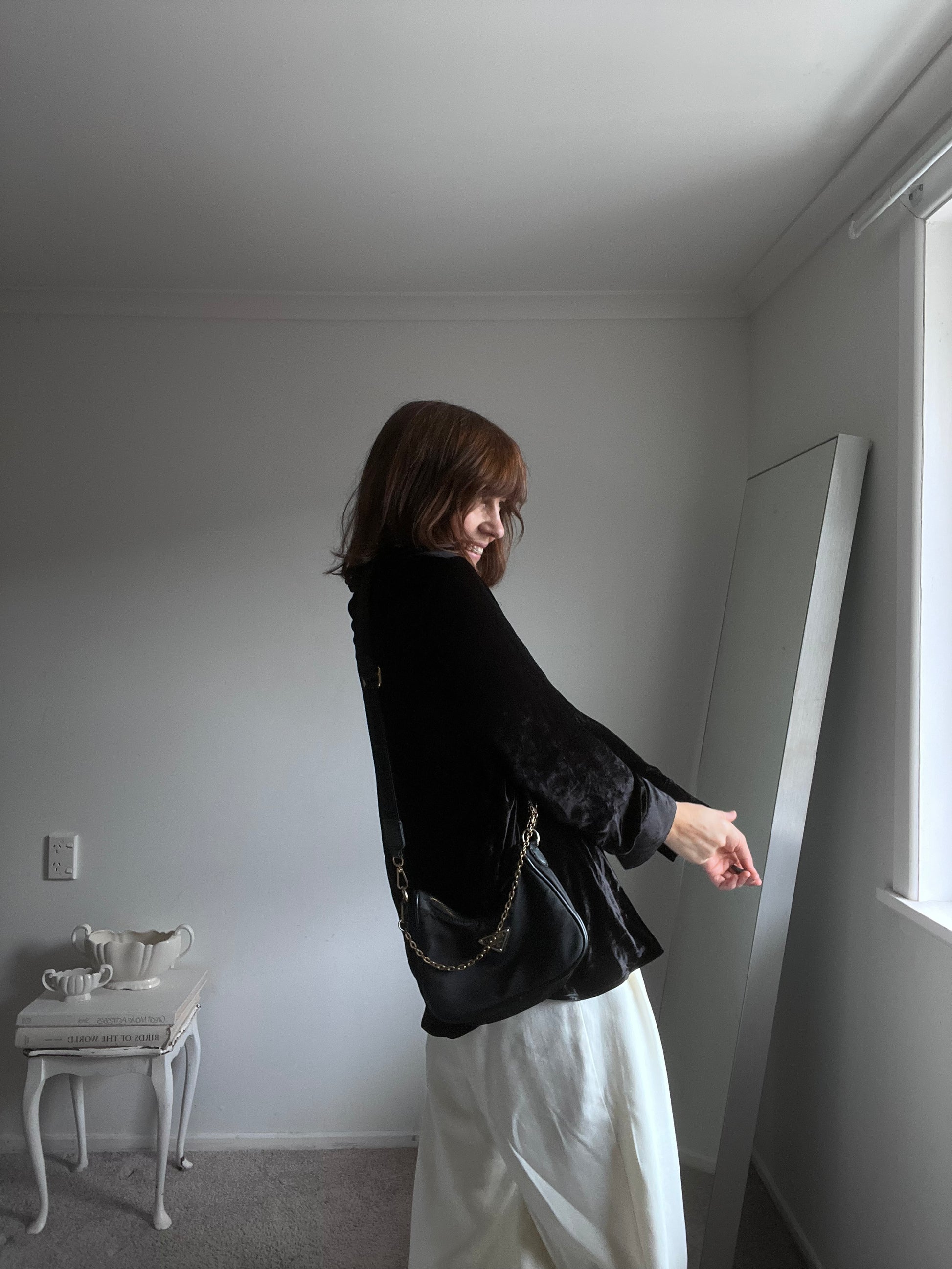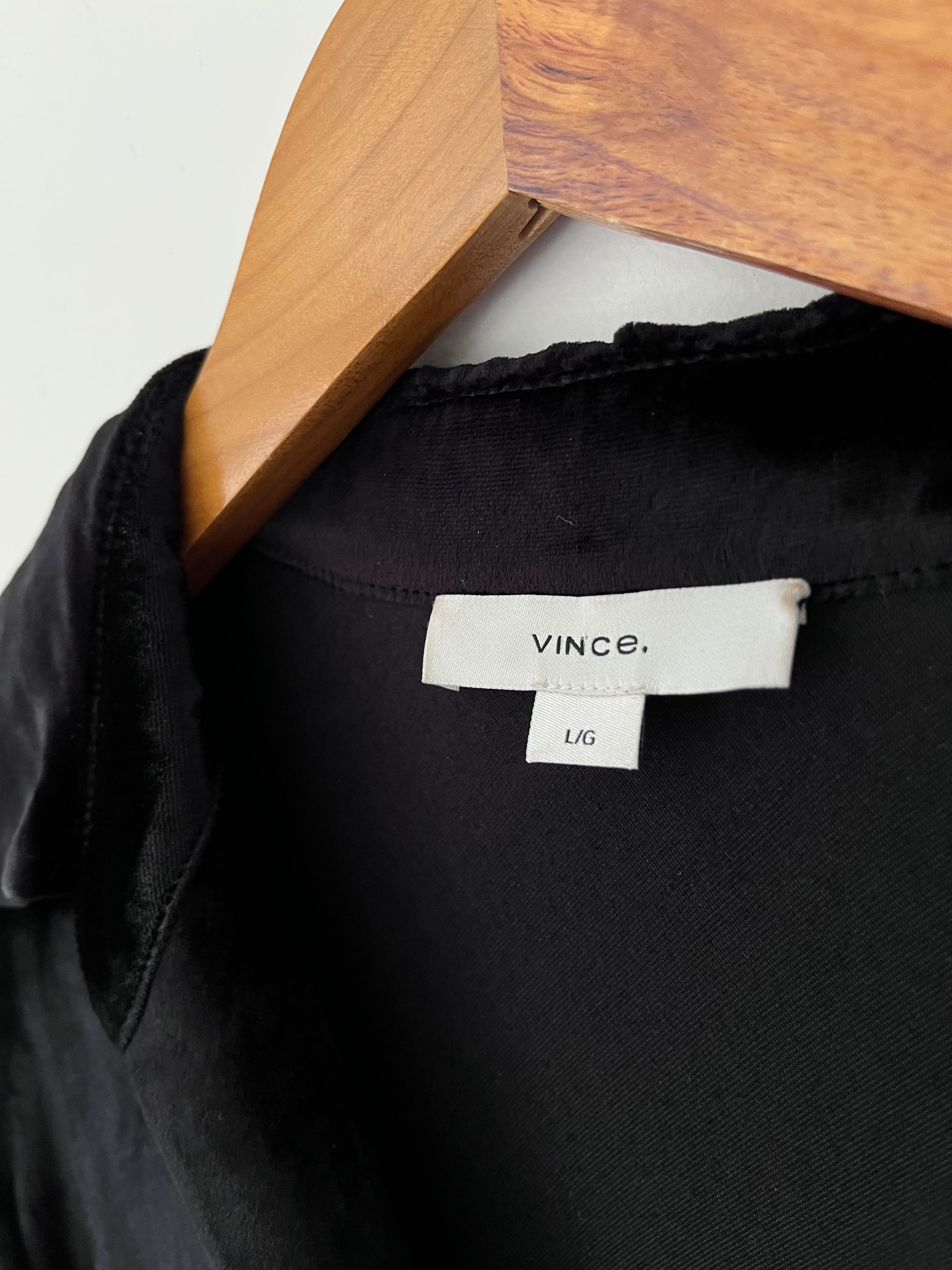 Size imo 8-12. Tagged size L. RRP$800 approx. Stunning VINCE black velvet-silk blend shirt. “A new Vince essential, our signature bias-cut shirt is reimagined in lustrous liquid velvet. The easy drape and shirttail hem are topped by a sensational open collar.” Length 74cm. Armpit-armpit 58cm. Composition: Viscose 82%, Silk 18%. Faults: none