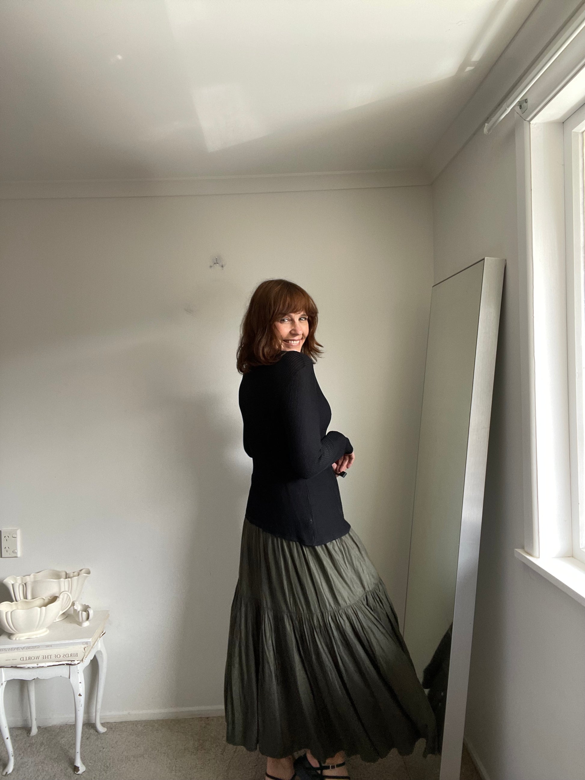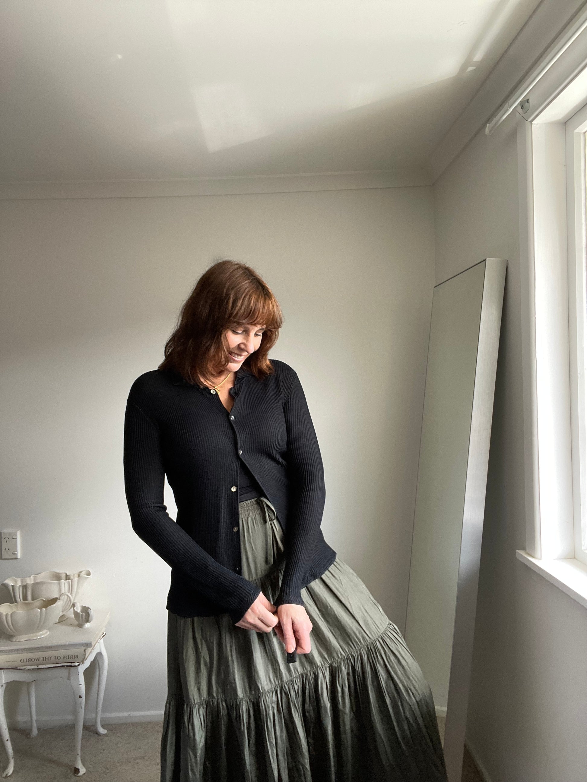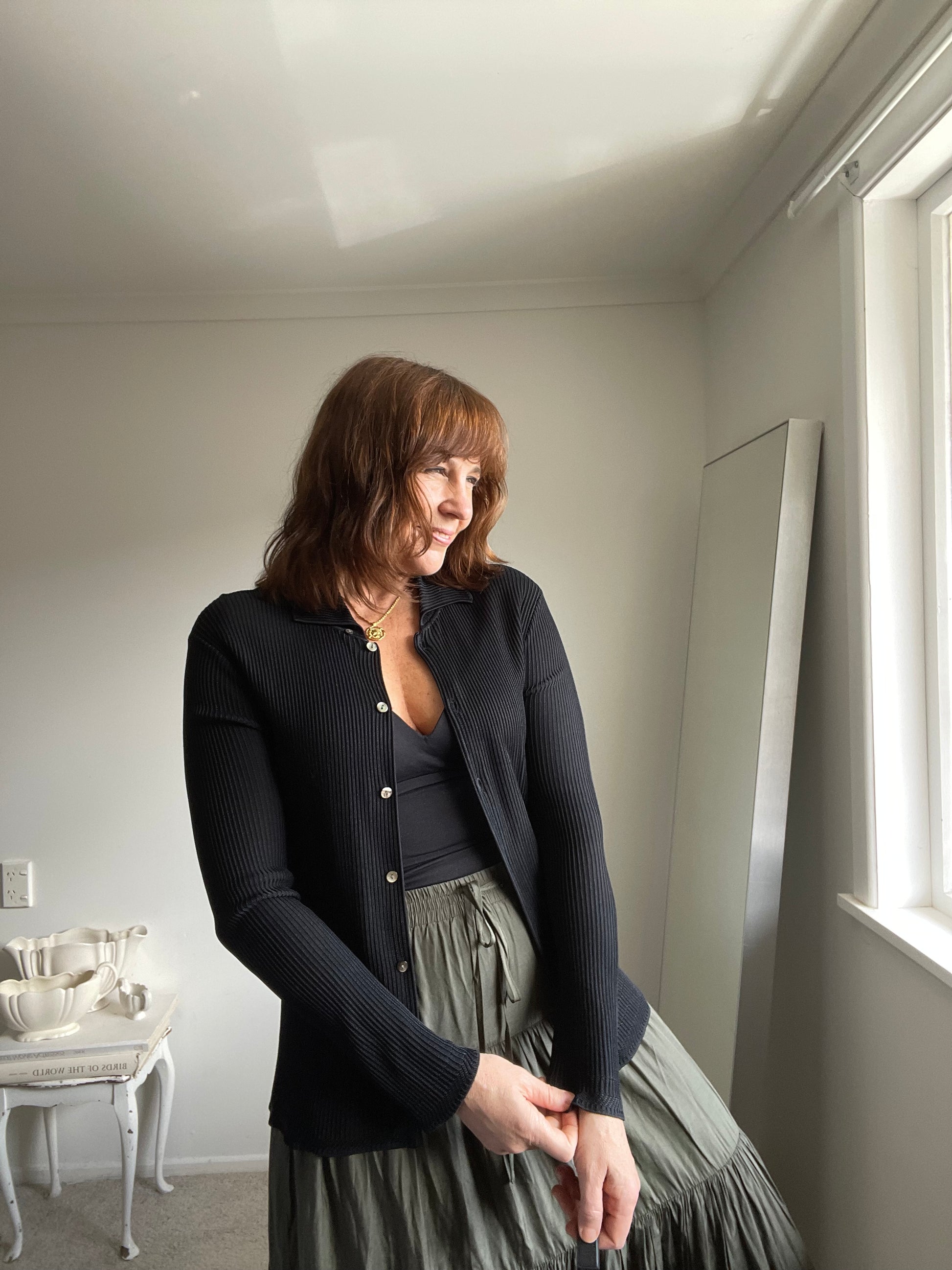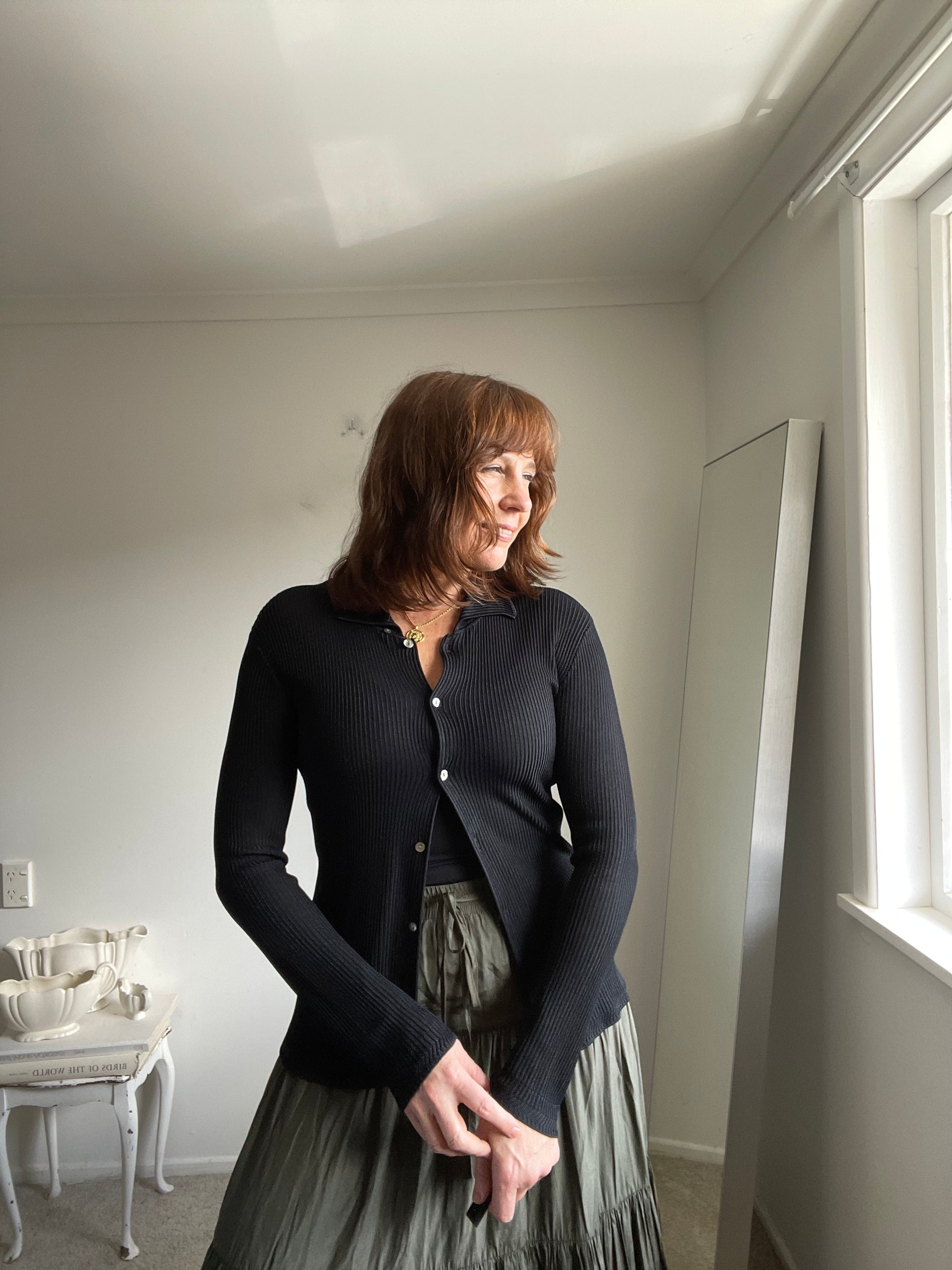 Size 10-12 imo. Tagged L. RRP$ unknown. Description: Black vintage COUNTRY ROAD finely ribbed knit cardigan with collar. Length 68cm. Armpit-armpit 47-50cm stretch without buttons gaping. Composition: viscose.