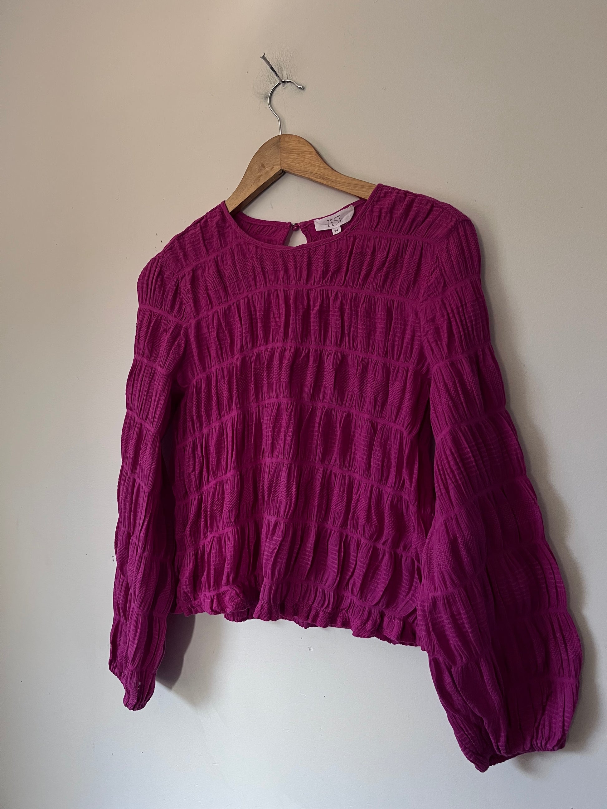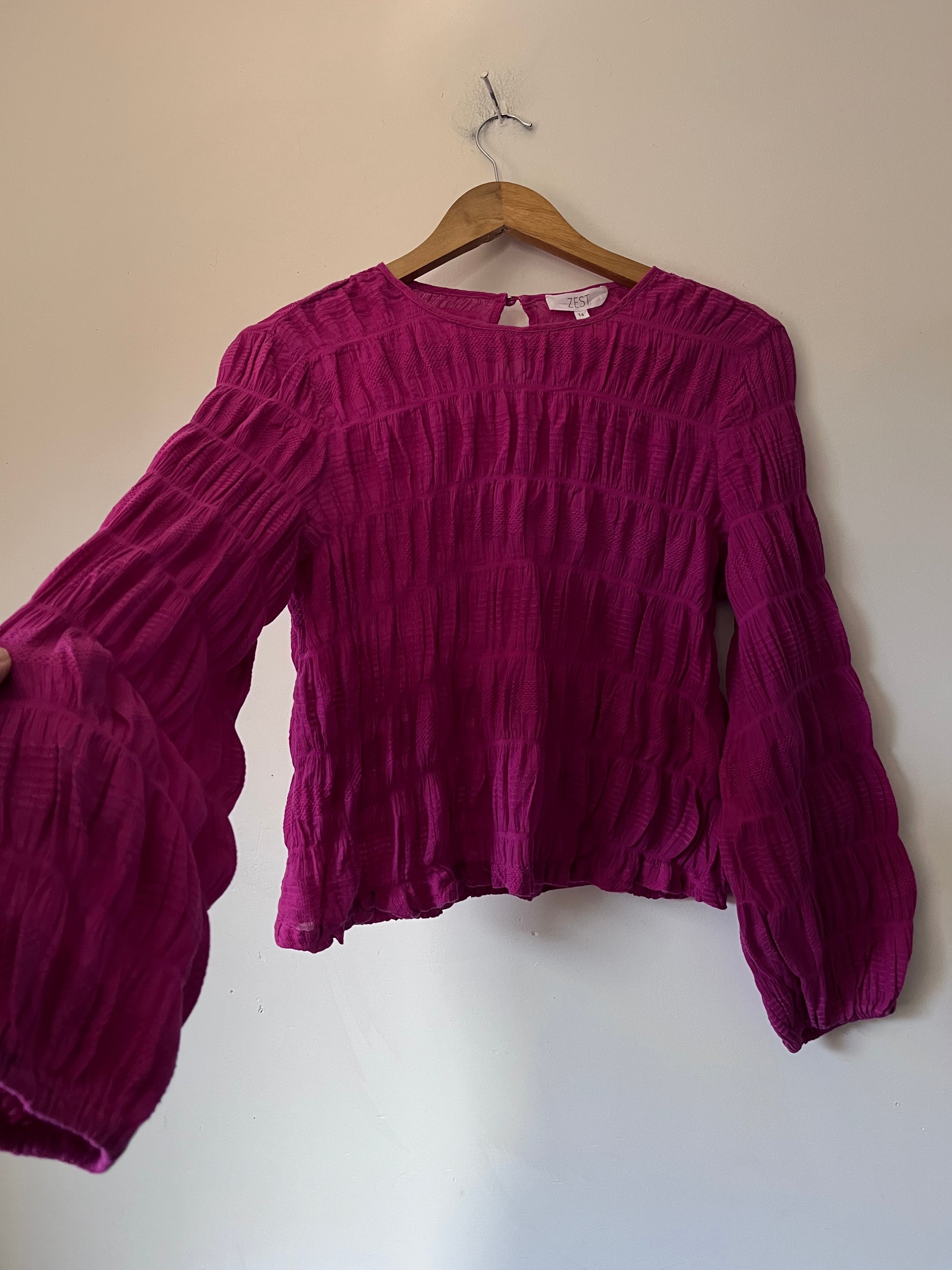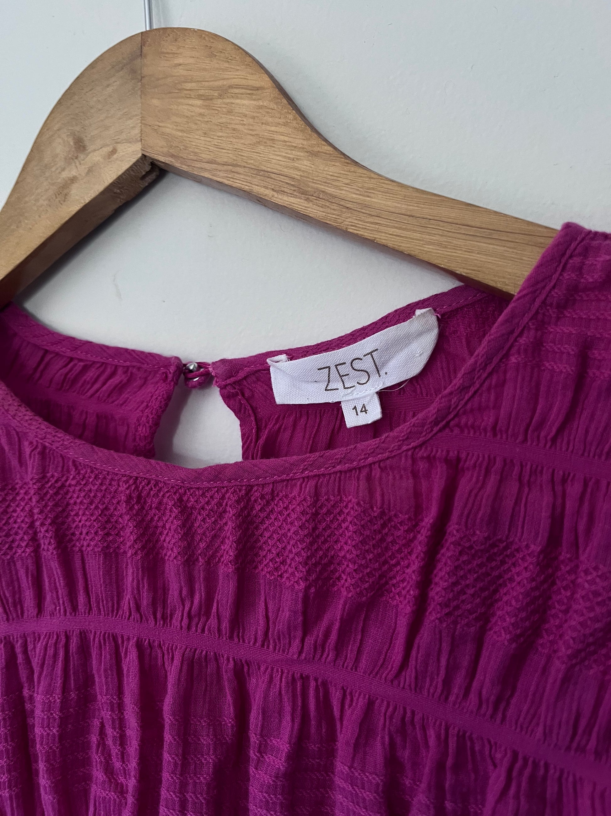 Size imo: 12-16. Tagged size: 14. RRP$. Stretchy texture top by ZEST, deep magenta. Length 51cm. Armpit-armpit 50-55cm easy stretch. Composition: cotton/elastane. Faults: none