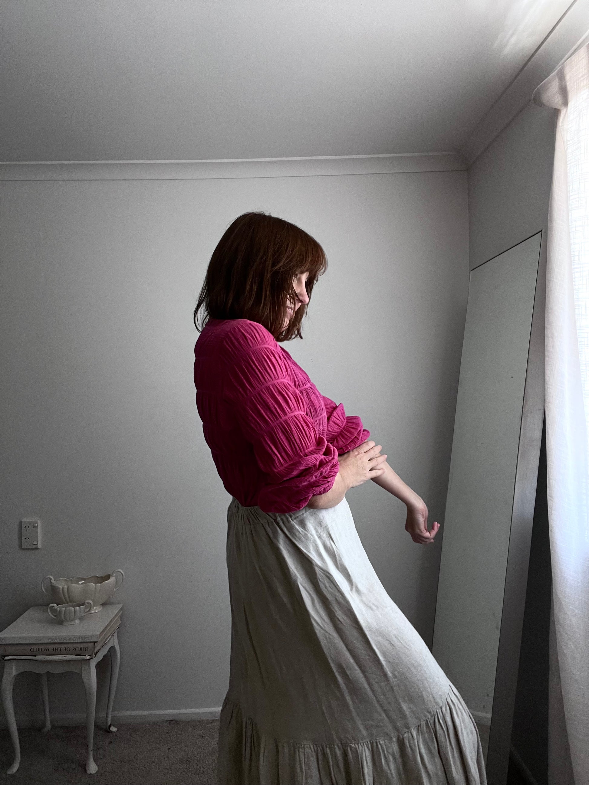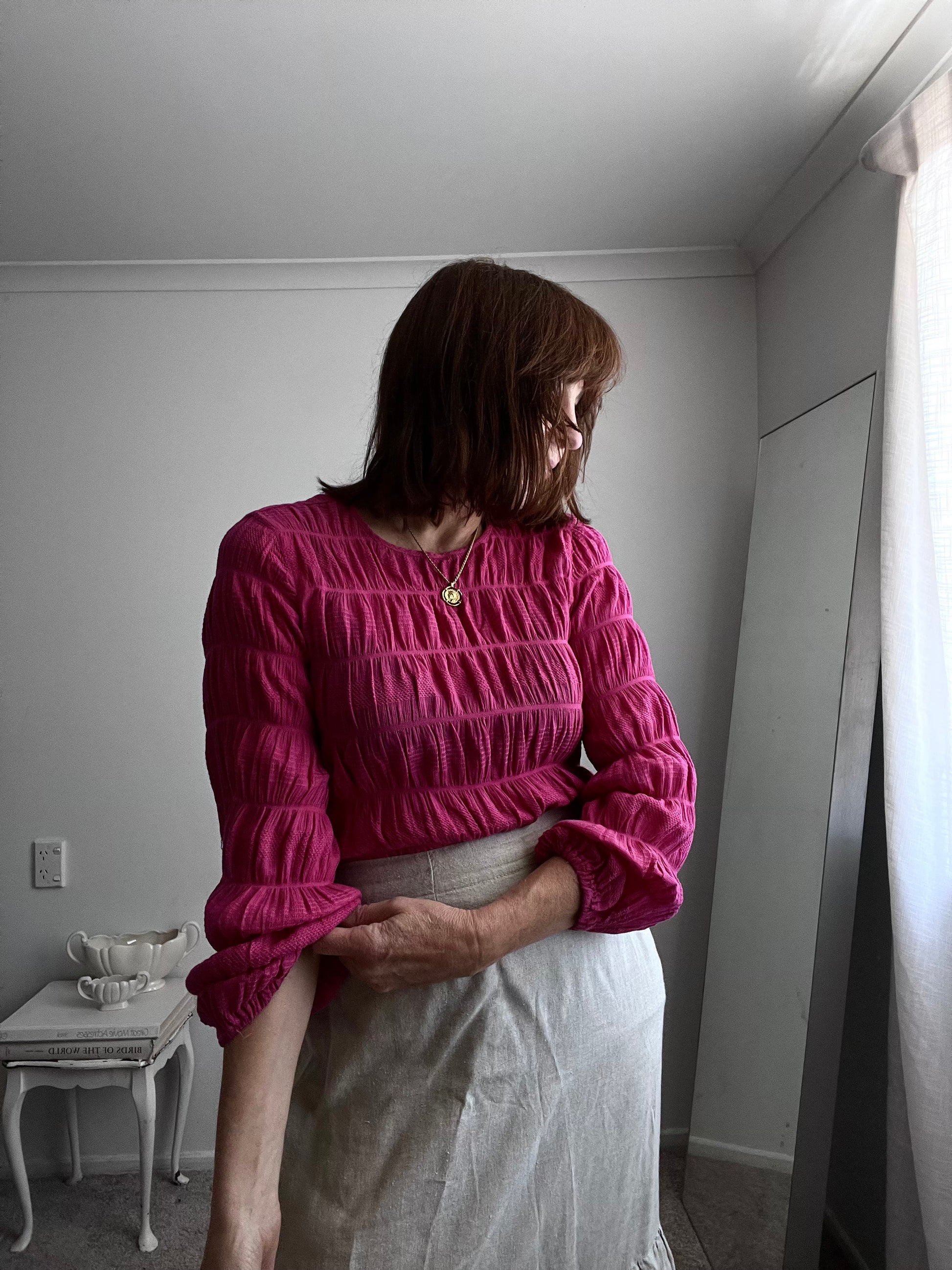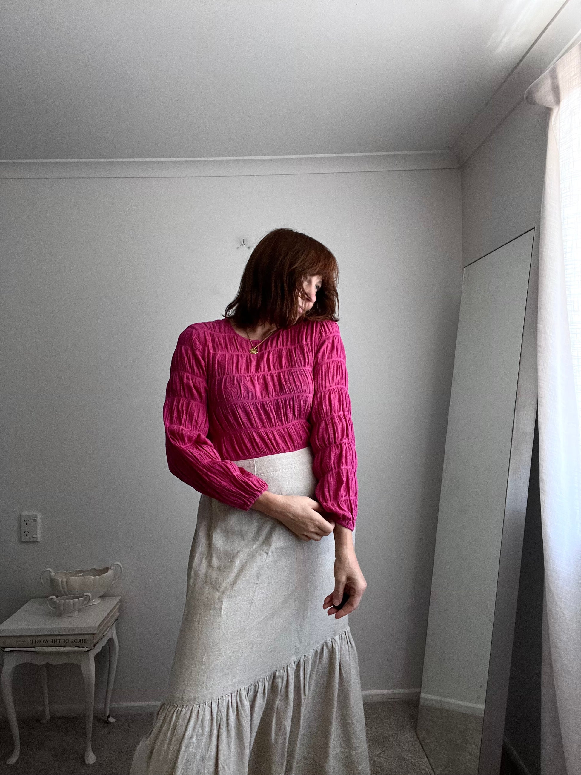 Size imo: 12-16. Tagged size: 14. RRP$. Stretchy texture top by ZEST, deep magenta. Length 51cm. Armpit-armpit 50-55cm easy stretch. Composition: cotton/elastane. Faults: none